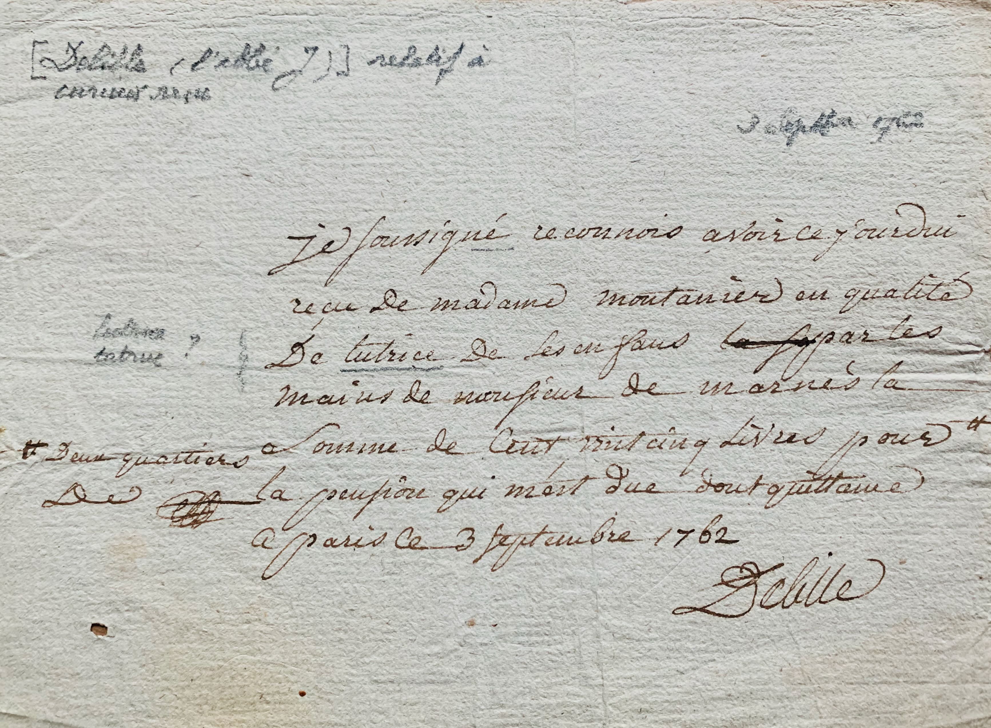 Quittance de 125 livres pour 2 quartiers de pension dues par Mme Montanier « en qualité de tutrice de ses enfants ». [Enfant naturel, Jacques Delille fut recueilli par la famille Montanier].