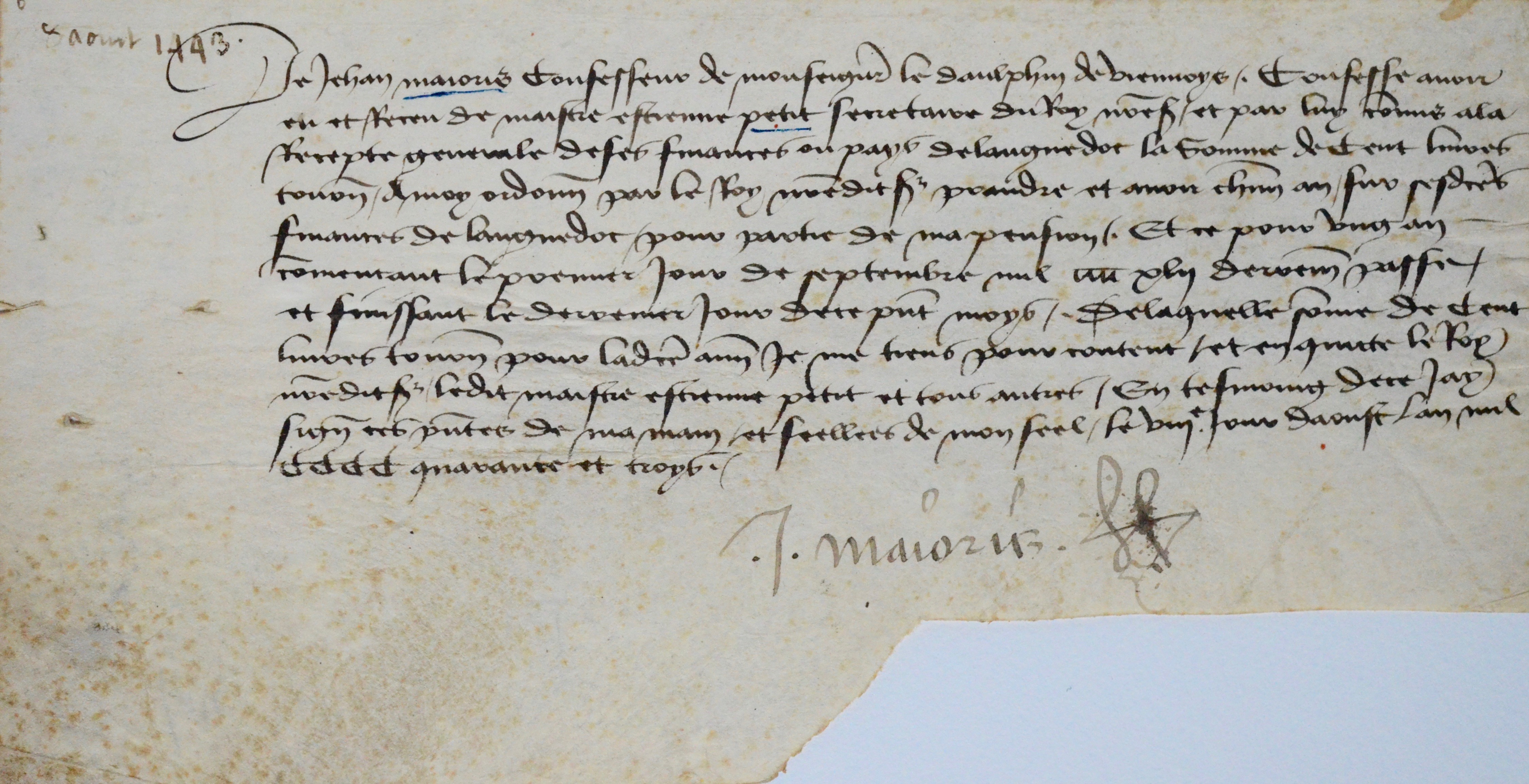 "Jean Maioris confesseur de monseigneur le daulphin de Viennoys, confesse avoir eu et receu de maistre Etienne Petit, secrétaire du Roy nostre Sr et par luy commis a la recepte générale de ses finances en pays de Languedoc la somme de cent livres tournois à moy ordonnée par le Roy nostre dict Sr prendre et avoir chaque an sur sesdictes finances de Languedoc pour partie de ma pension [...]" et ce pour une année.