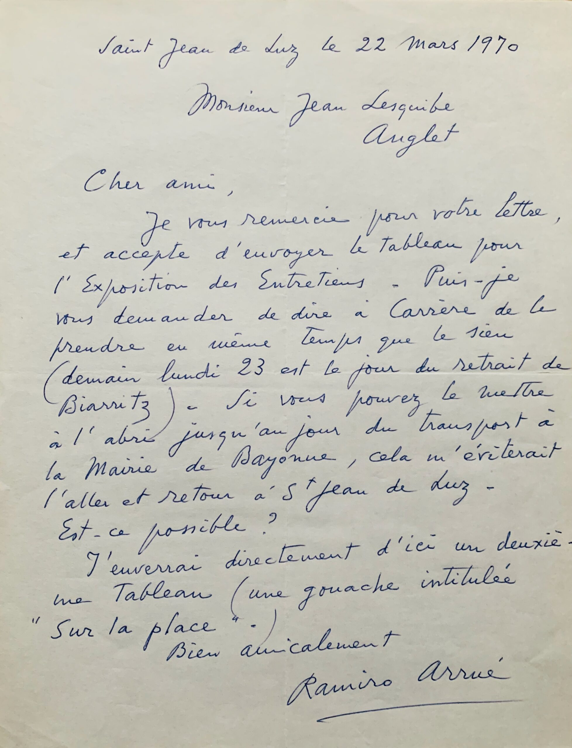 "Je vous remercie pour votre lettre, et accepte d'envoyer le tableau pour l'Exposition des Entretiens [de Bayonne]. Puis-je vous demander de dire à Carrère de le prendre en même temps que le sien (demain lundi 23 est le jour de retrait de Biarritz). Si vous pouvez le mettre à l'abri jusqu'au jour du transport à la mairie de Bayonne, cela m'éviterait l'aller et retour à St Jean de Luz. Est-ce possible?