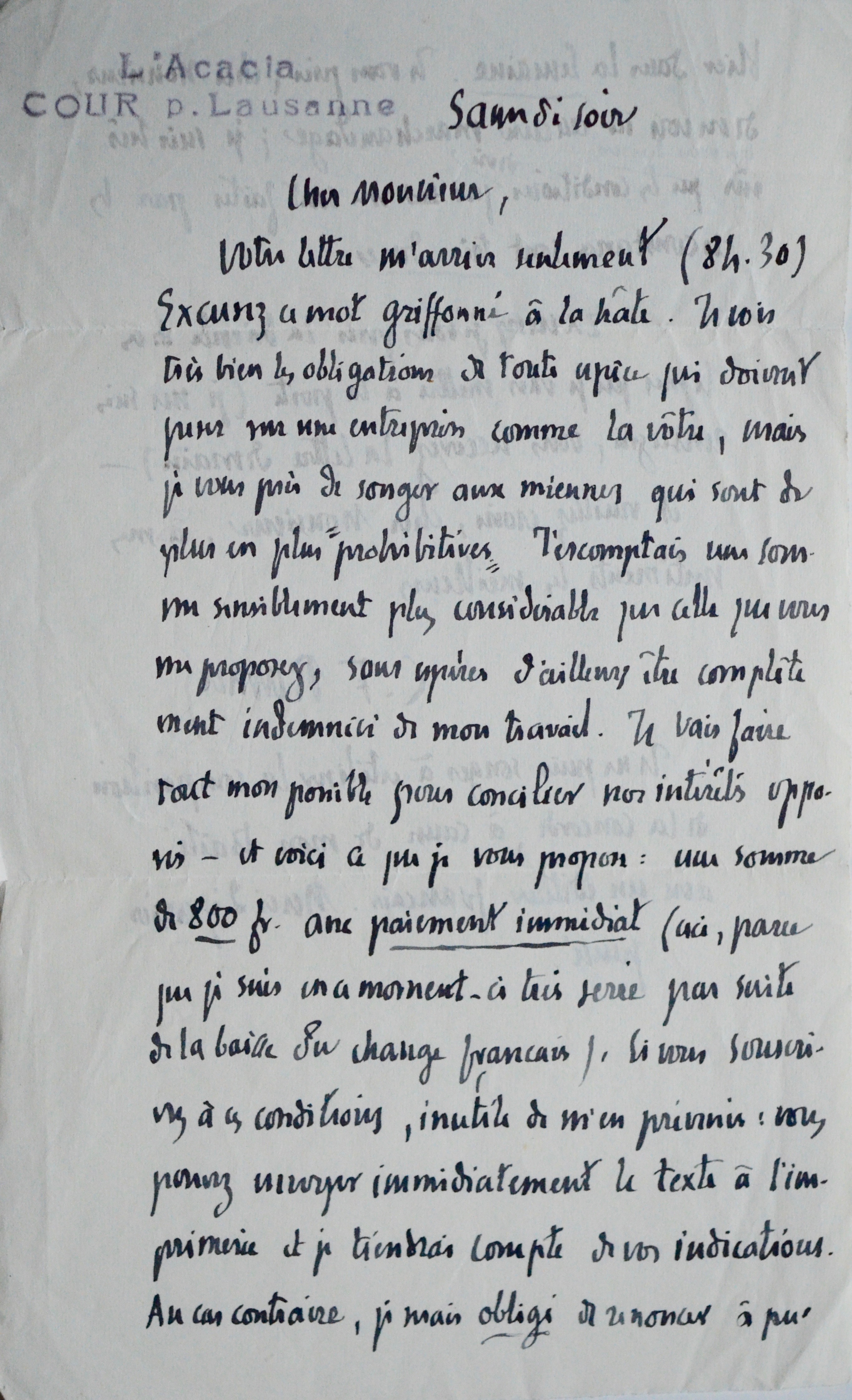 Ramuz demande à son correspond de prendre en compte ses obligations "qui sont de plus en plus prohibitives. J'escomptais une somme sensiblement plus considérable que celle que vous me proposez, sans espérer d'ailleurs être complètement indemnisé de mon travail. Je vais faire tout mon possible pour concilier nos intérêts opposés - et voici ce que je vous propose : une somme de 800 fr avec paiement immédiat" étant dans la gène. Il poursuit "Si vous souscrivez à ces conditions, inutile de m'en prévenir : vous pouvez envoyer immédiatement le texte à l'imprimerie et je tiendrai compte de vos indications. Au cas contraire, je serais obligé de renoncer à publier dans La Semaine [...]". Ce n'est en aucun cas un vil marchandage mais les "circonstances sont très dures".