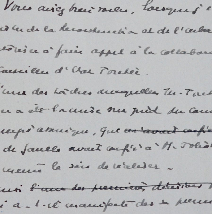 "Vous avez bien voulu, lorsque j'étais ministre de la Reconstruction et de l'urbanisme, m'autoriser à faire appel à la collaboration de M. le conseiller d'État Toutée. L'une des tâches auxquelles M. Toutée a eu à participer a été la mise sur pied du Commissariat à l'Energie Atomique, que le général de Gaulle avait confié à M. Joliot-Curie et à moi-même le soin de réaliser". Il demande à ce que Toutée puisse obtenir le poste de conseiller juridique.