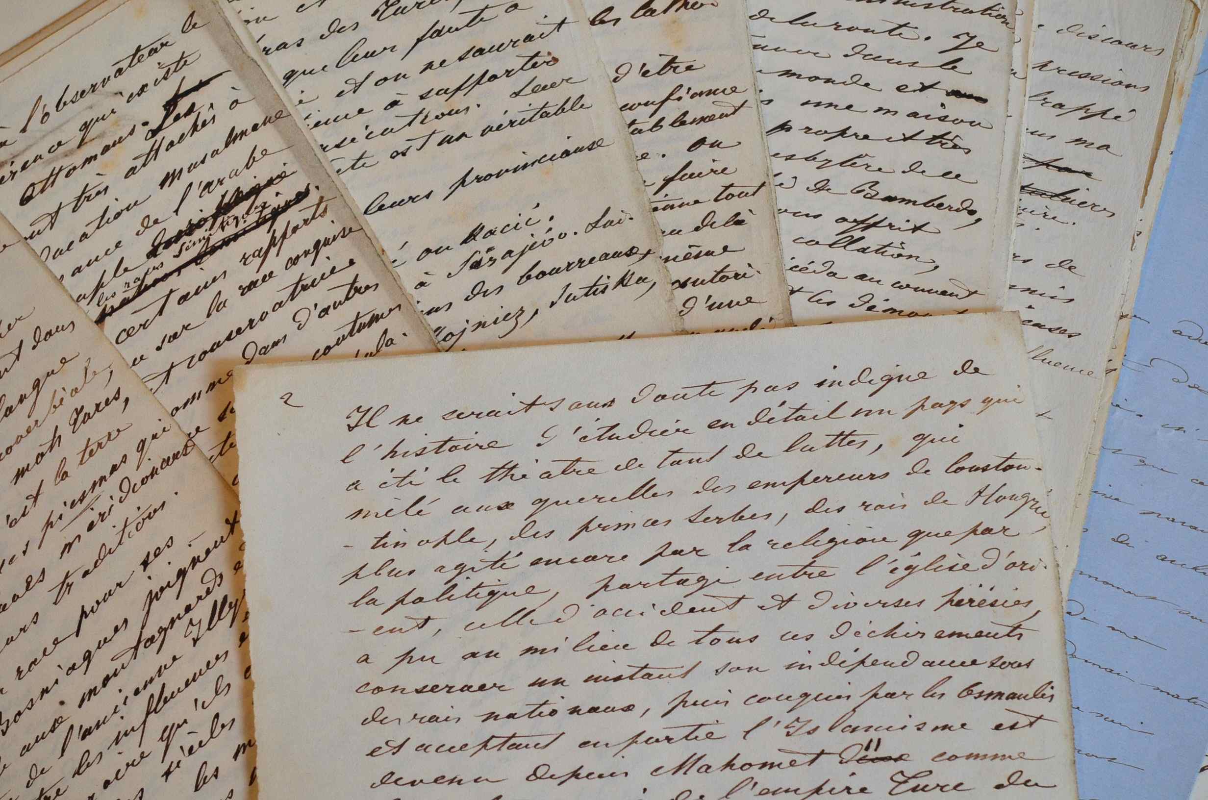 Sont joints : un jeu d’épreuves corrigées (34 pp. in-8) et 4 lettres relatives à sa mission par Drouyn de Lhuys (ministre des Affaires Etrangères), Fortoul (ministre de l'Instruction publique) et 2 de Charles Fortoul (chef de cabinet du ministre).