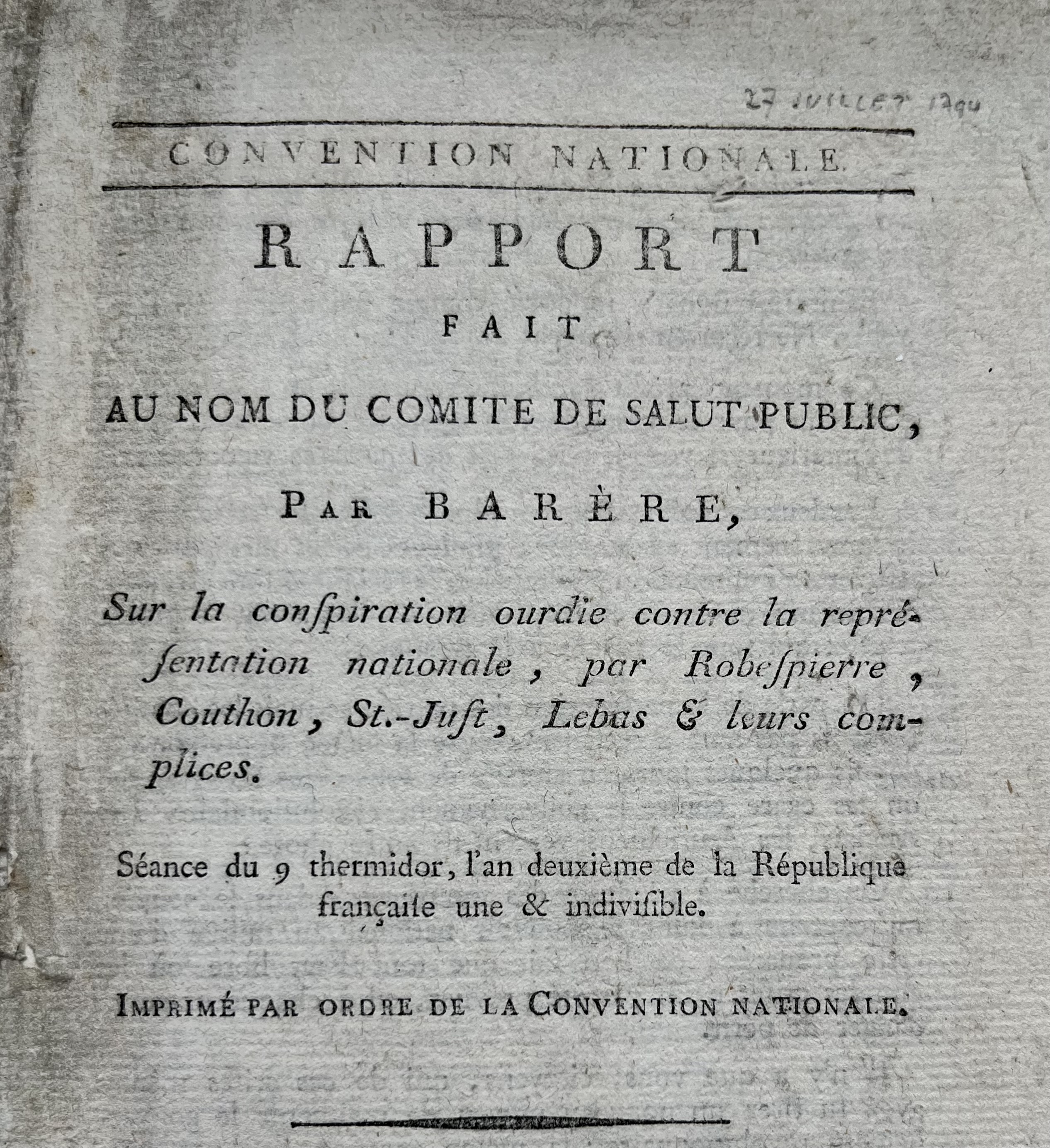 Rare document sur la chute de Robespierre : «Rapport fait au nom du Comité de Salut public par Barère sur la conspiration ourdie contre la représentation nationale, par Robespierre, Couthon, St-Just, Lebas & leurs complices. Séance du 9 thermidor l'an deuxième de la République française une & indivisible».