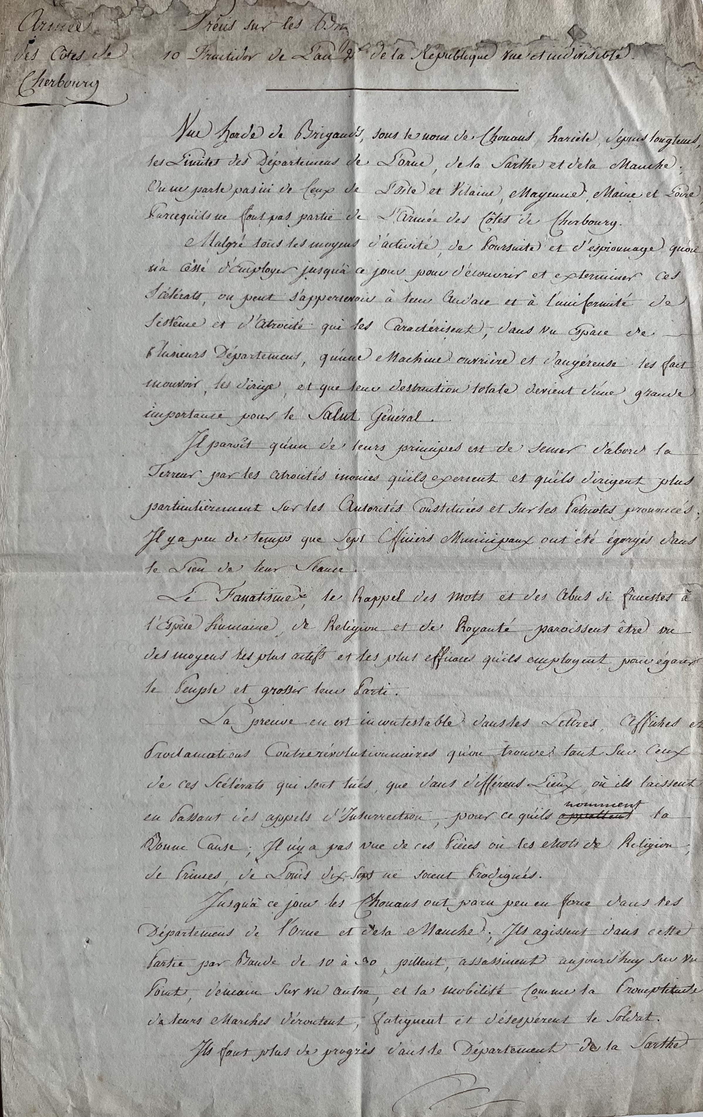 Rapport sur la situation des Chouans dans les départements de Basse-Normandie. «Une horde de brigands, sous le nom de Chouans, harcèle depuis longtemps les limites des départements de l'Orne, de la Sarthe et de la Manche […]. Malgré tous les moyens d'activité, de poursuite et d'espionnage qu'on n'a cessé d'employer jusqu'à ce jour pour découvrir et exterminer ces scélérats, on peut s'apercevoir à leur audace et à l'uniformité de système et d'atrocité qui les caractérisent, dans un espace de plusieurs départements, qu'une machine ouvrière et dangereuse les fait mouvoir, les dirige, et que leur destruction totale devient d'une grande importance pour le salut général […]. Jusqu'à ce jour, les Chouans ont paru peu en force dans les départements de l'Orne et de la Manche. Ils agissent dans cette partie par bande de 10 à 30, pillent, assassinent sur un point, demain sur un autre, et la mobilité comme la promptitude de leurs marchent déroutent, fatiguent et désespèrent le soldat […]».