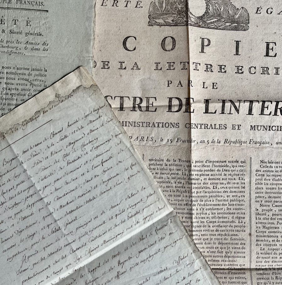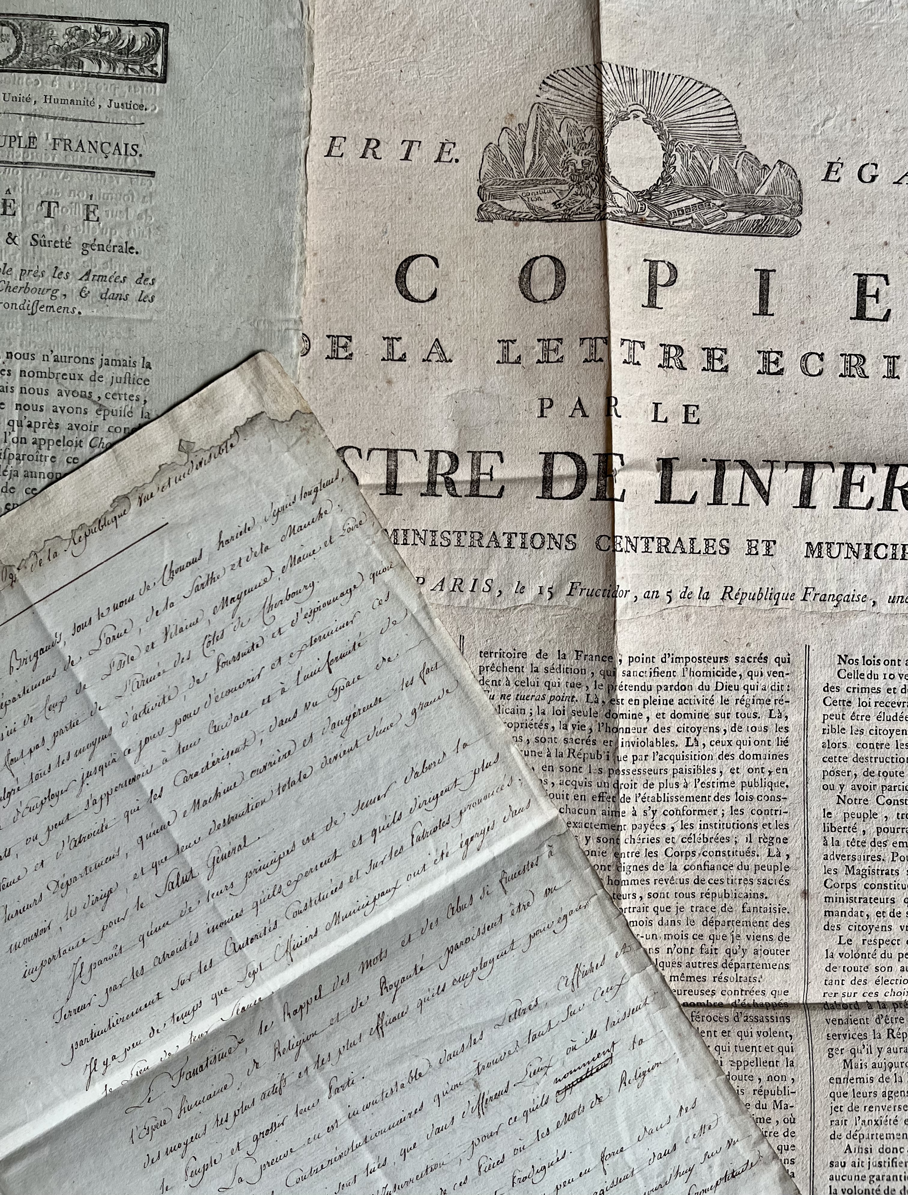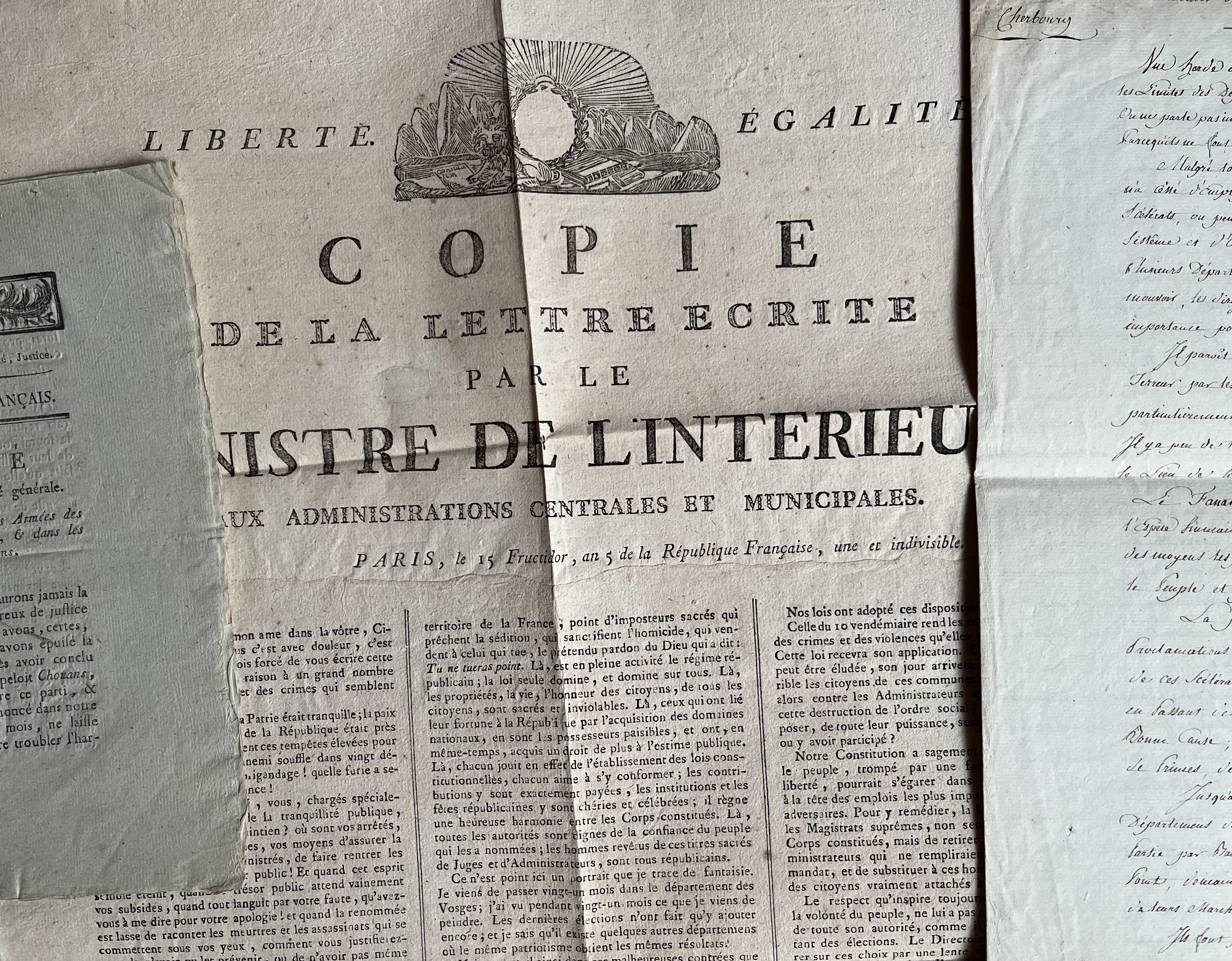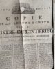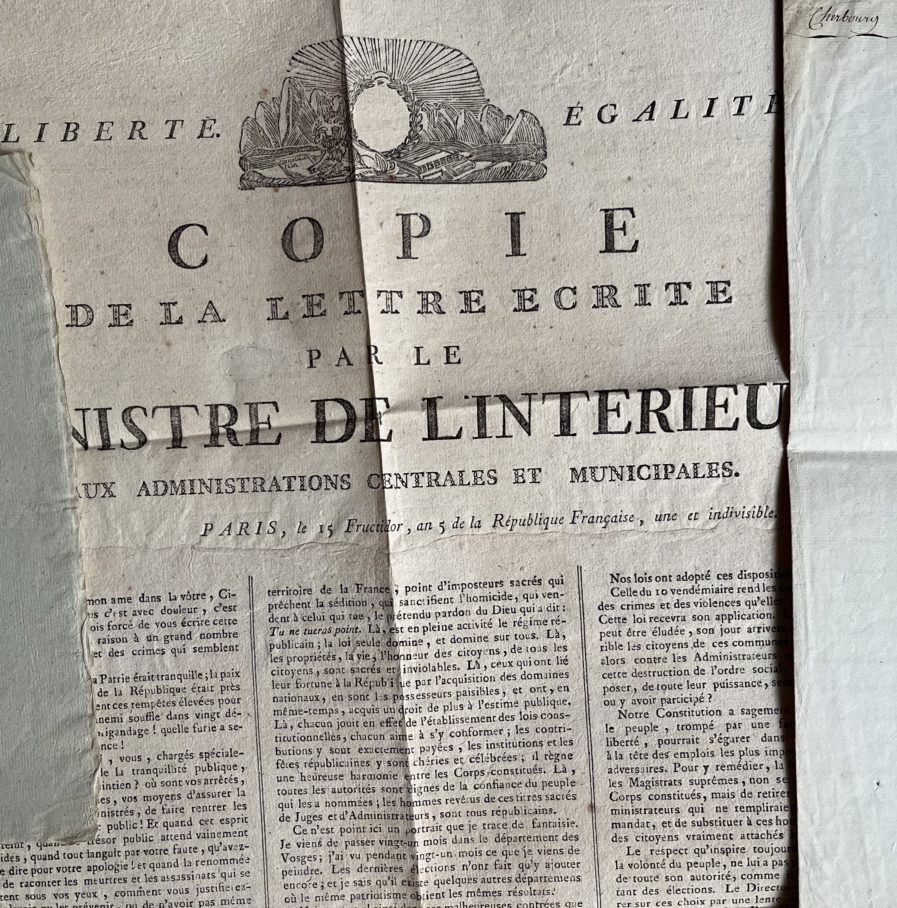 -une grande affiche : «Copie de la lettre écrite par le Ministre de l'Intérieur aux administrations centrales et municipales» du 15 fructidor an 5.