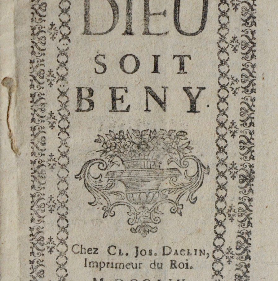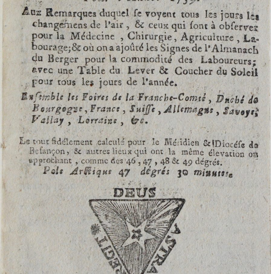 Almanach ou pronostication pour l'année 1759. Imprimé à Besançon, chez Claude-Joseph Daclin, imprimeur du Roi, en 1759.