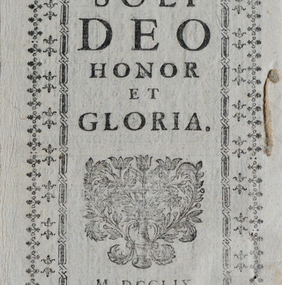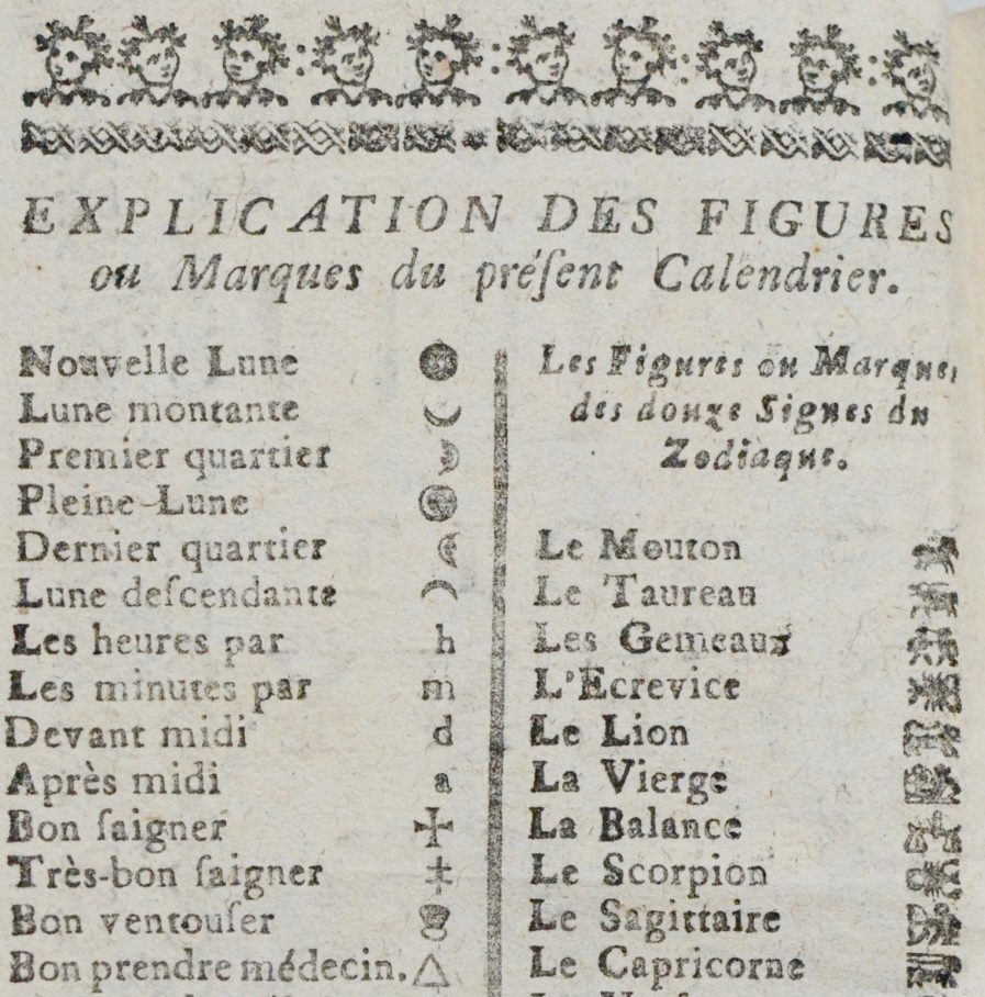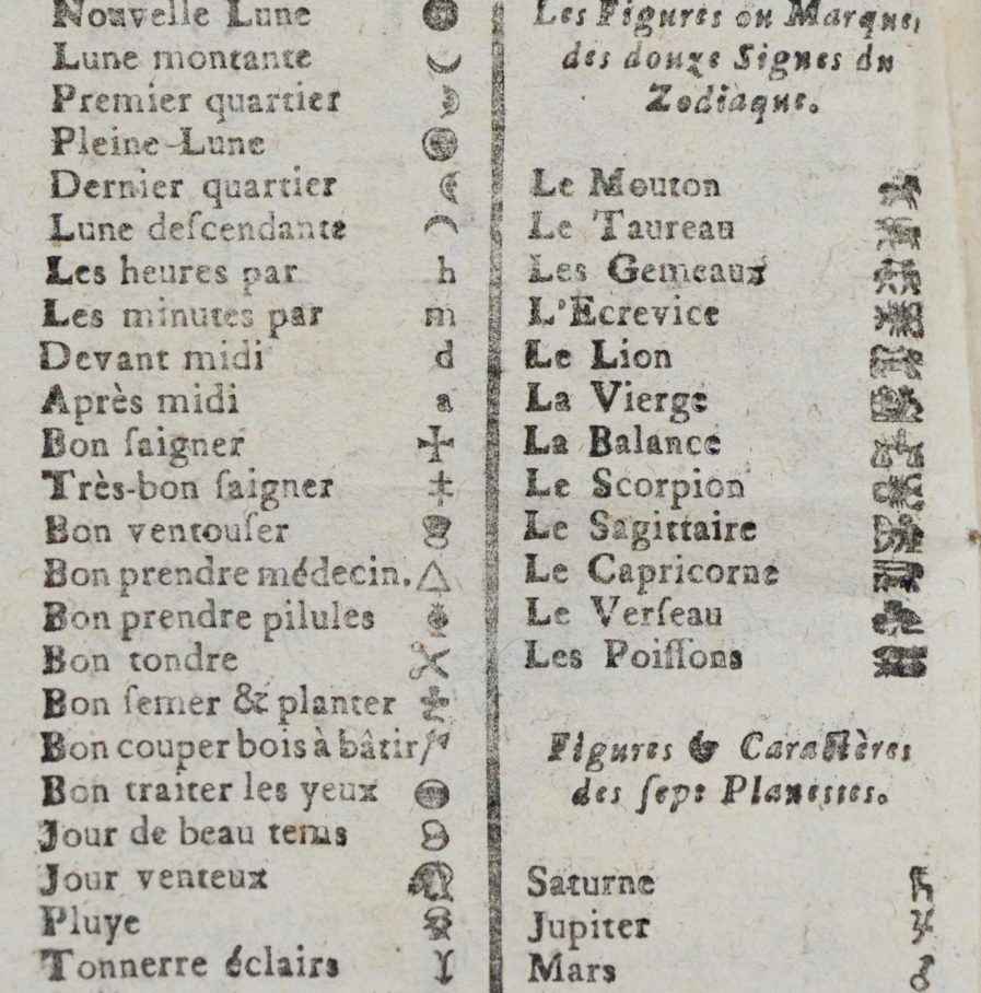 "Dieu soit Beny" en 1ère de couverture et "Soli Deo Honor et Gloria", en 4e. Charmants petits symboles et figures gravés et expliqués, représentant les astres, les éléments, les signes du zodiaque, etc. Beau encadrements gravés sur bois.