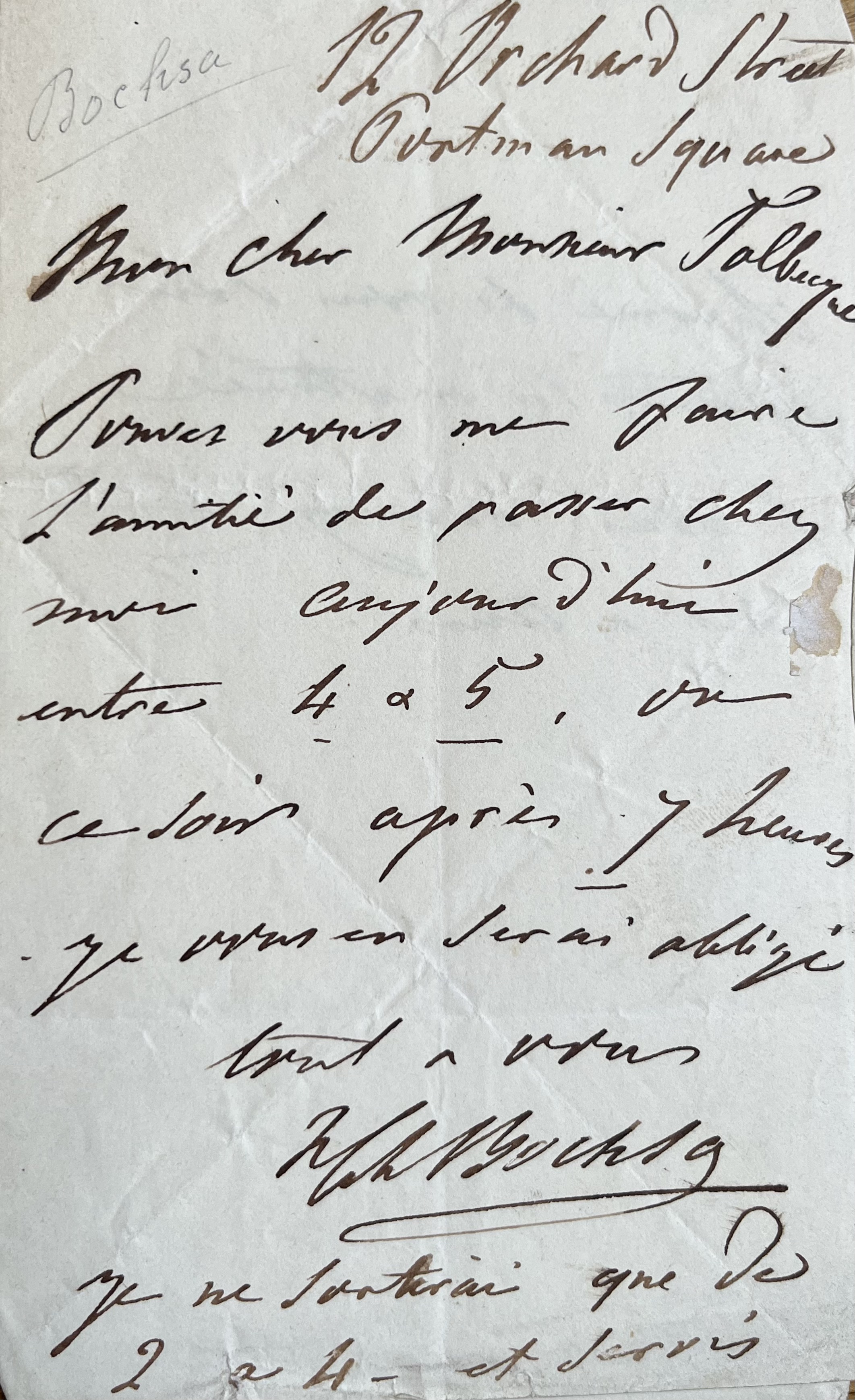 Le musicien Nicolas-Charles Bochsa envoie les détails de son emploi du temps londonien à son correspondant et fixe un rendez-vous.