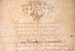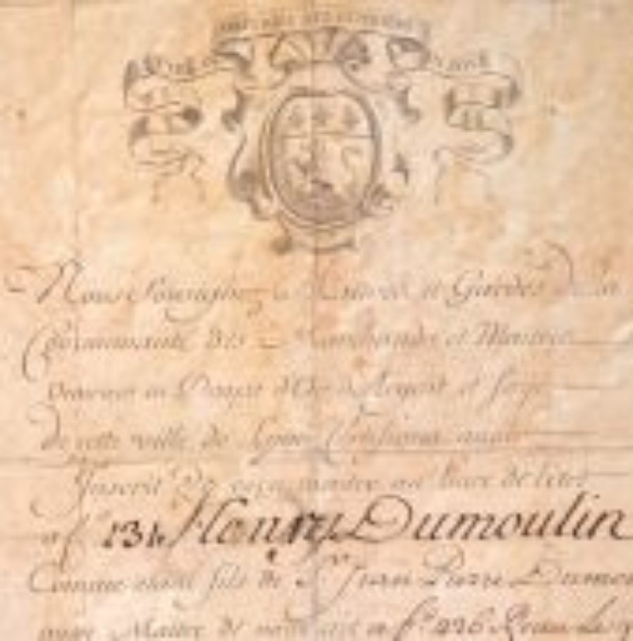 Rare brevet délivré par les "maîtres et gardes de la communauté des marchands et maîtres ouvriers en draps d'or, d'argent et soie de cette ville de Lyon". Ils reçoivent maître Henry Dumoulin "comme étant fils de Sr Jean Pierre Dumoulin aussi maître de notre art". Le document est signé par 5 maîtres (Girardon, Defarge, Madinier, etc.)