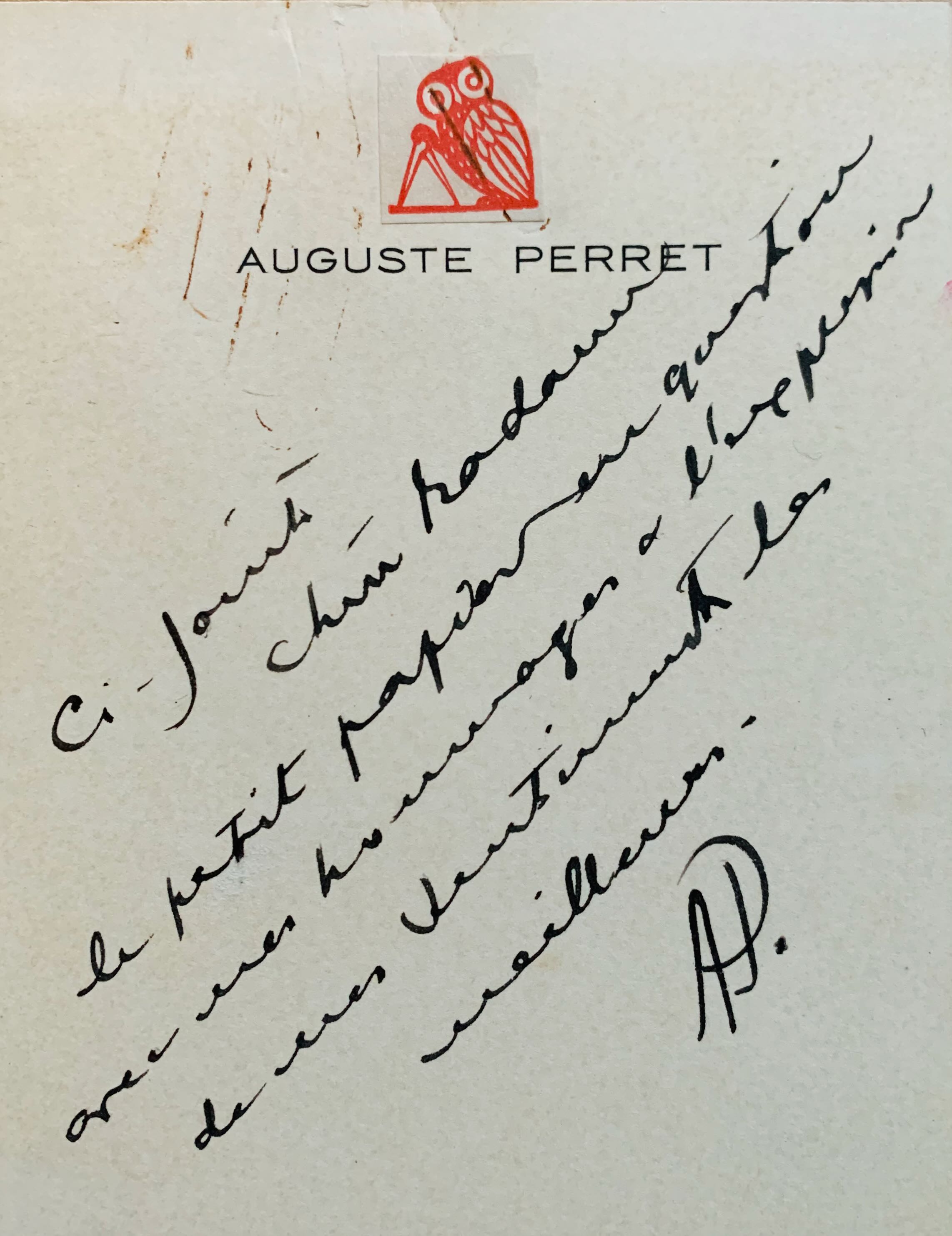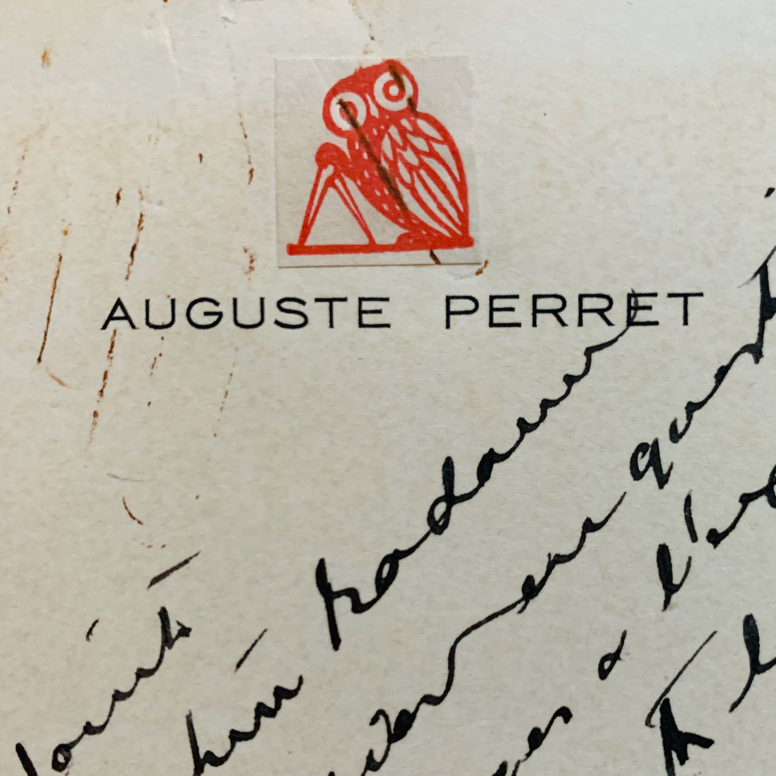 Sur une carte à son nom, ornée d'une petite vignette rouge, ajoutée, représentant une chouette tenant un compas, Auguste Perret écrit ces quelques lignes :