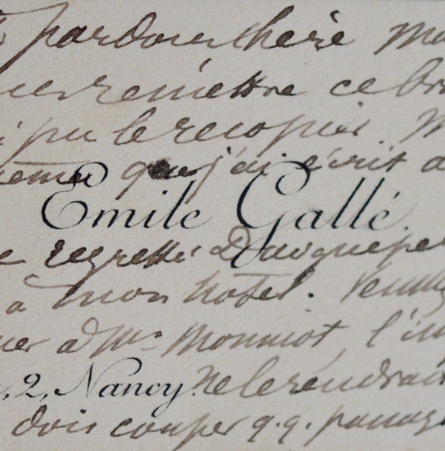 Encre brune sur carte de visite imprimée "Emile Gallé - Garenne, 2, Nancy".