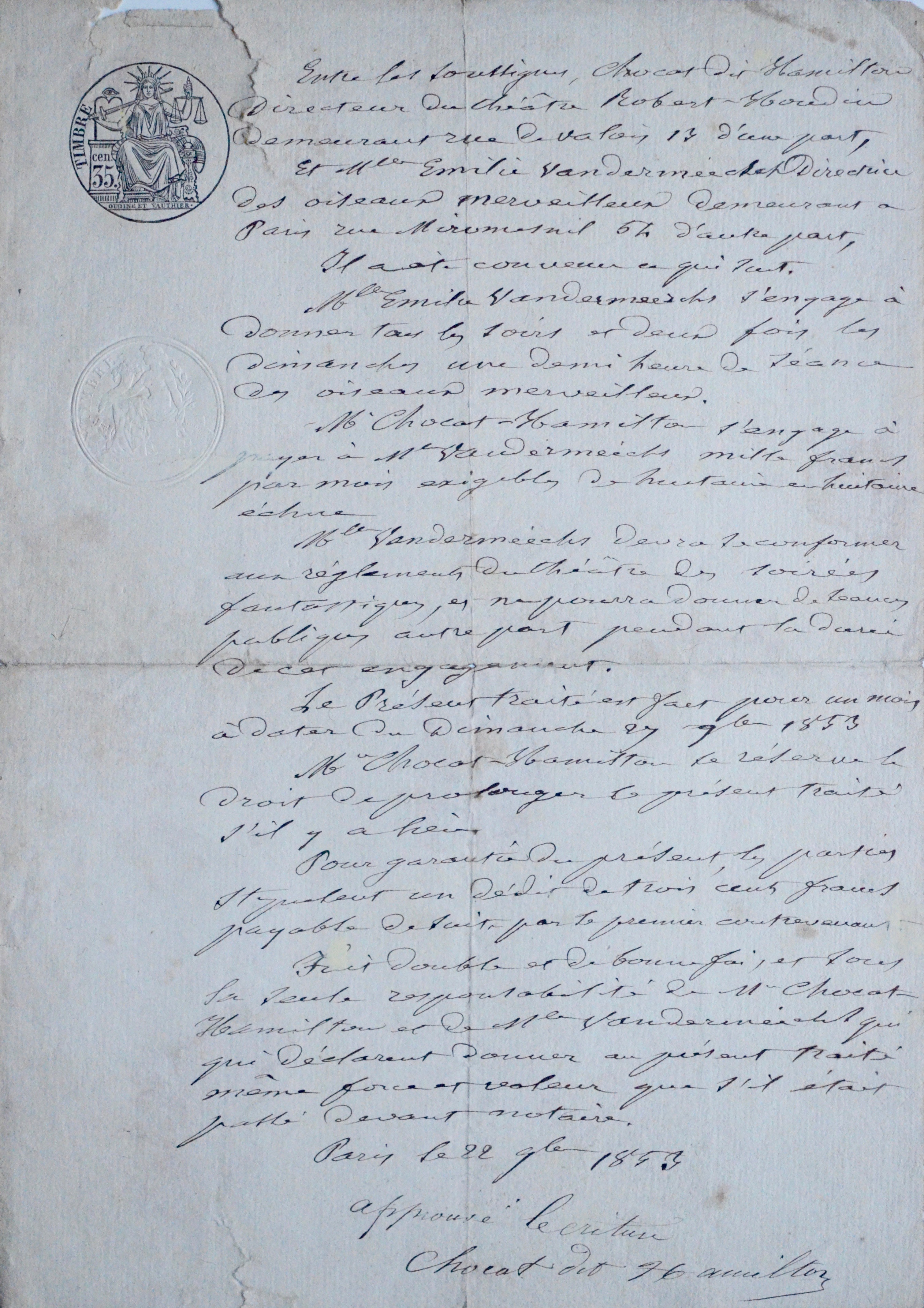 Très rare contrat passé devant notaire avec le Théâtre Robert-Houdin, "entre les soussignés Chocat dit Hamilton directeur du théâtre Robert Houdin […] et Mlle Émilie Vandermeersch, directrice des Oiseaux merveilleux". "Mlle Émilie Vandermeersch s’engage à donner tous les soirs et deux fois les dimanches une demi-heure de séance des Oiseaux Merveilleux", Chocat s’engageant à la rémunérer 1000 francs par mois. "Mlle Vandermeersch devra se conformer aux règlements du théâtre des soirées fantastiques, et ne pourra donner de séances publiques autre part pendant la durée de cet engagement". Traité pour un mois avec possibilité de prolongation.