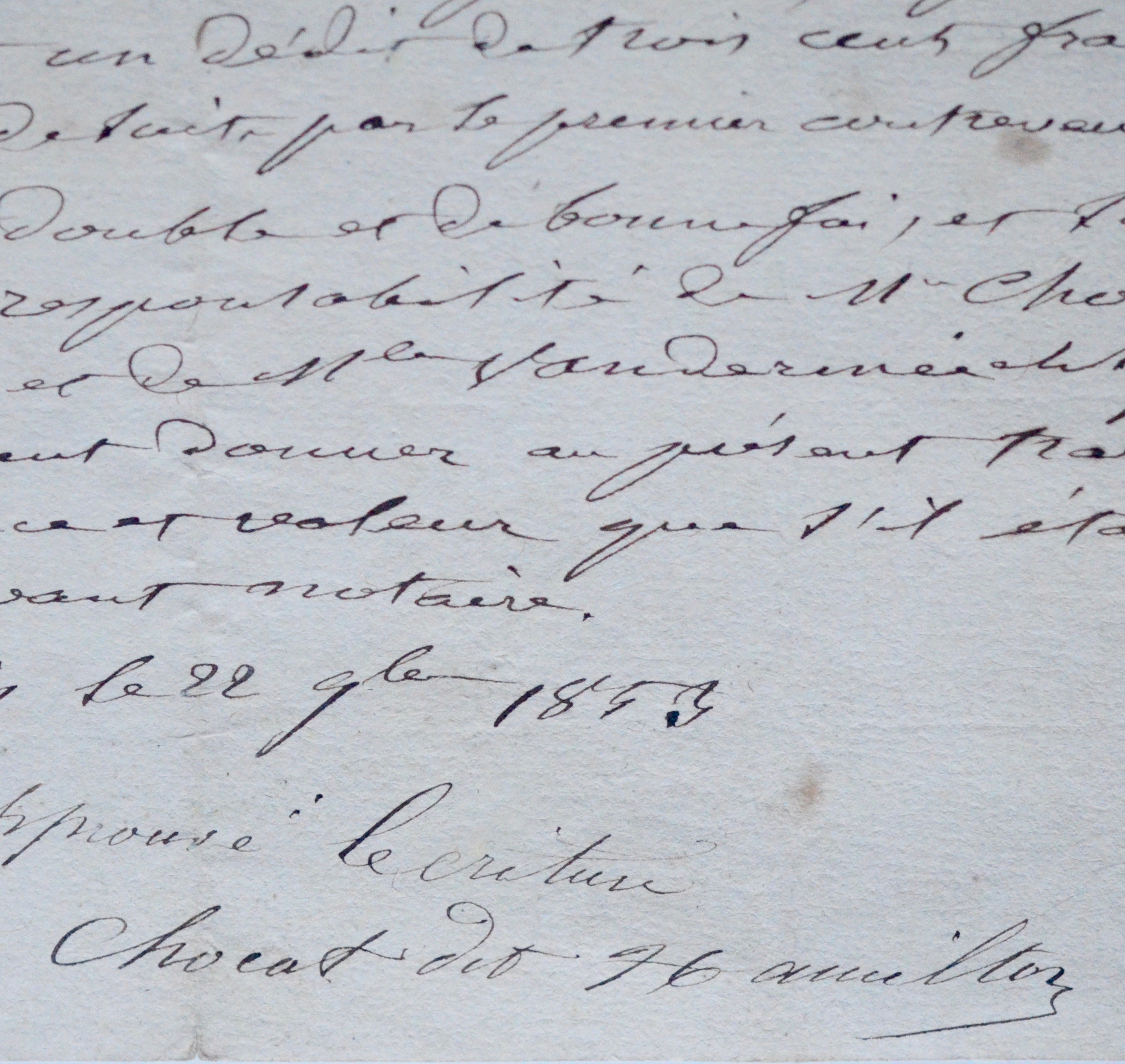 Pierre-Étienne-Auguste Chocat (1812/1877)[Magie - Théâtre Robert-Houdin]. Pièce signée par le magicien Pierre-Étienne-Auguste Chocat, « Chocat dit Hamilton », avec une ligne autographe. Il fut l'assistant, le beau-frère et le successeur de Robert Houdin, qui lui confia son théâtre en 1852.