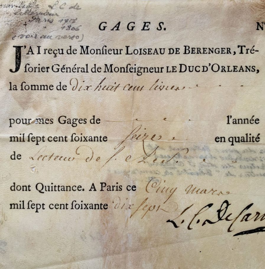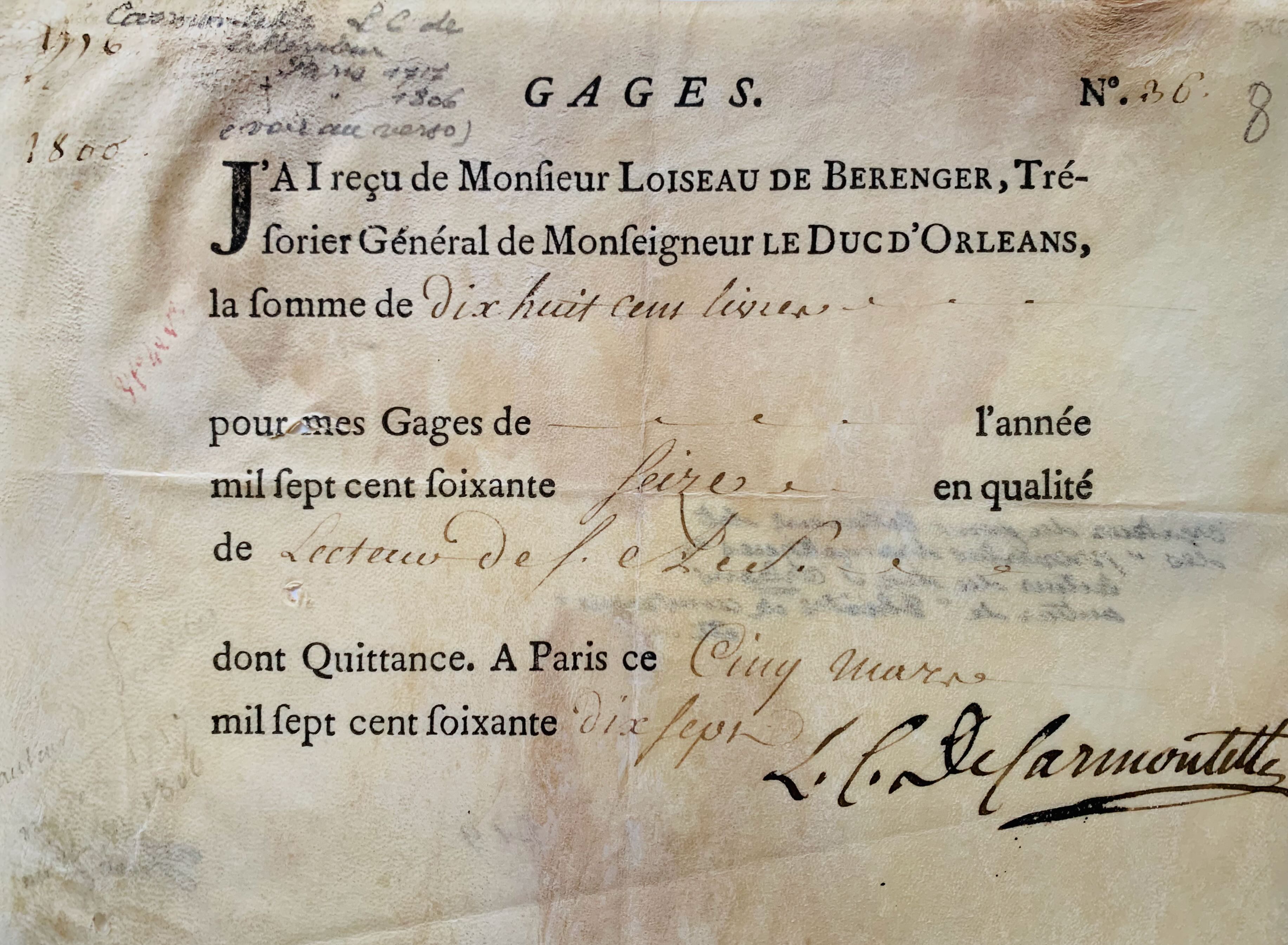 Par ce document (en partie imprimé sur vélin), Carmontelle reçoit la somme de 1800 livres en paiement de ses gages de "lecteur de S.A.S." [le duc d'Orléans].