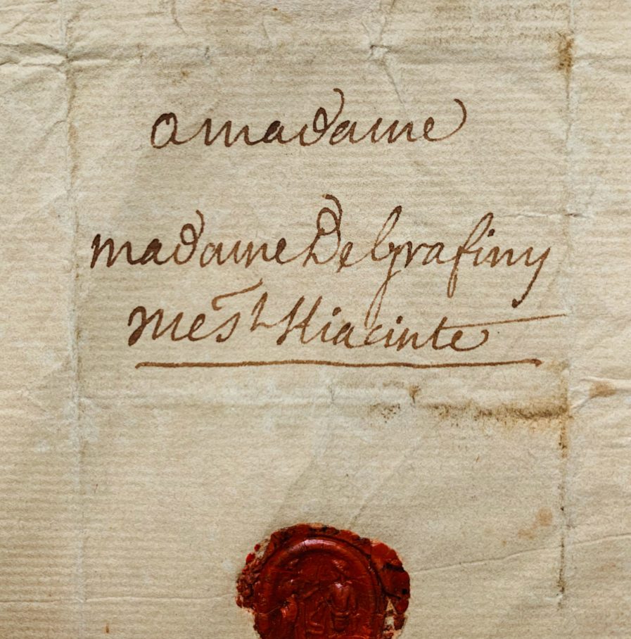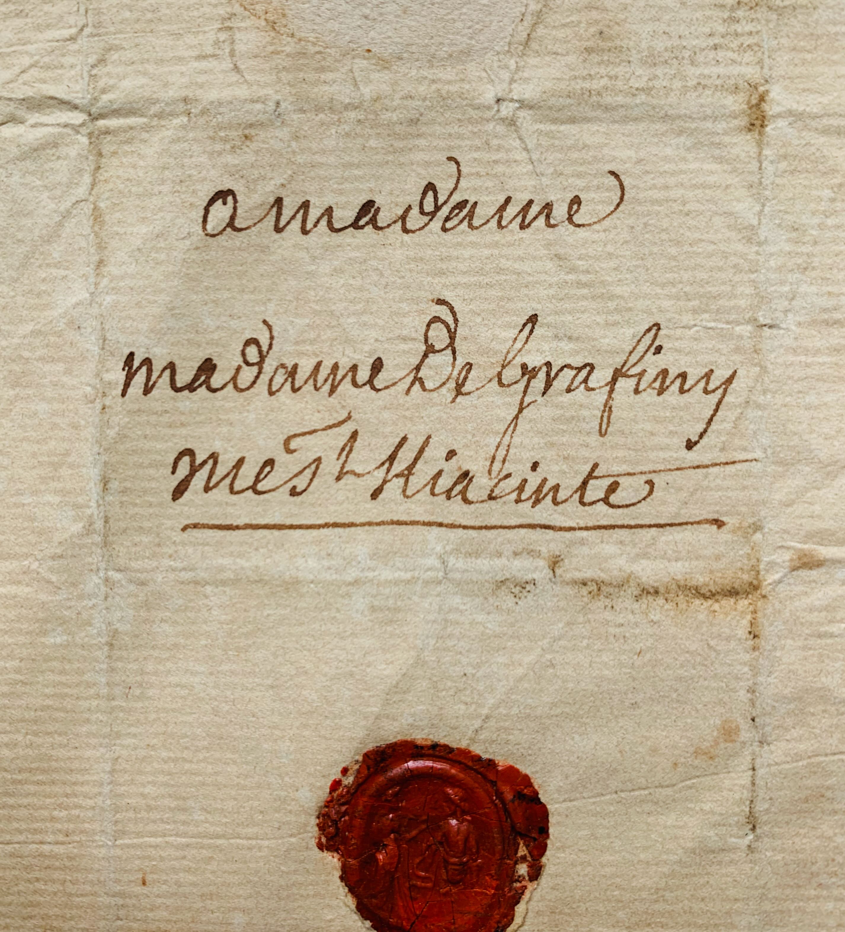 Adresse au dos (rue Saint-Hyacinthe), avec joli cachet de cire.