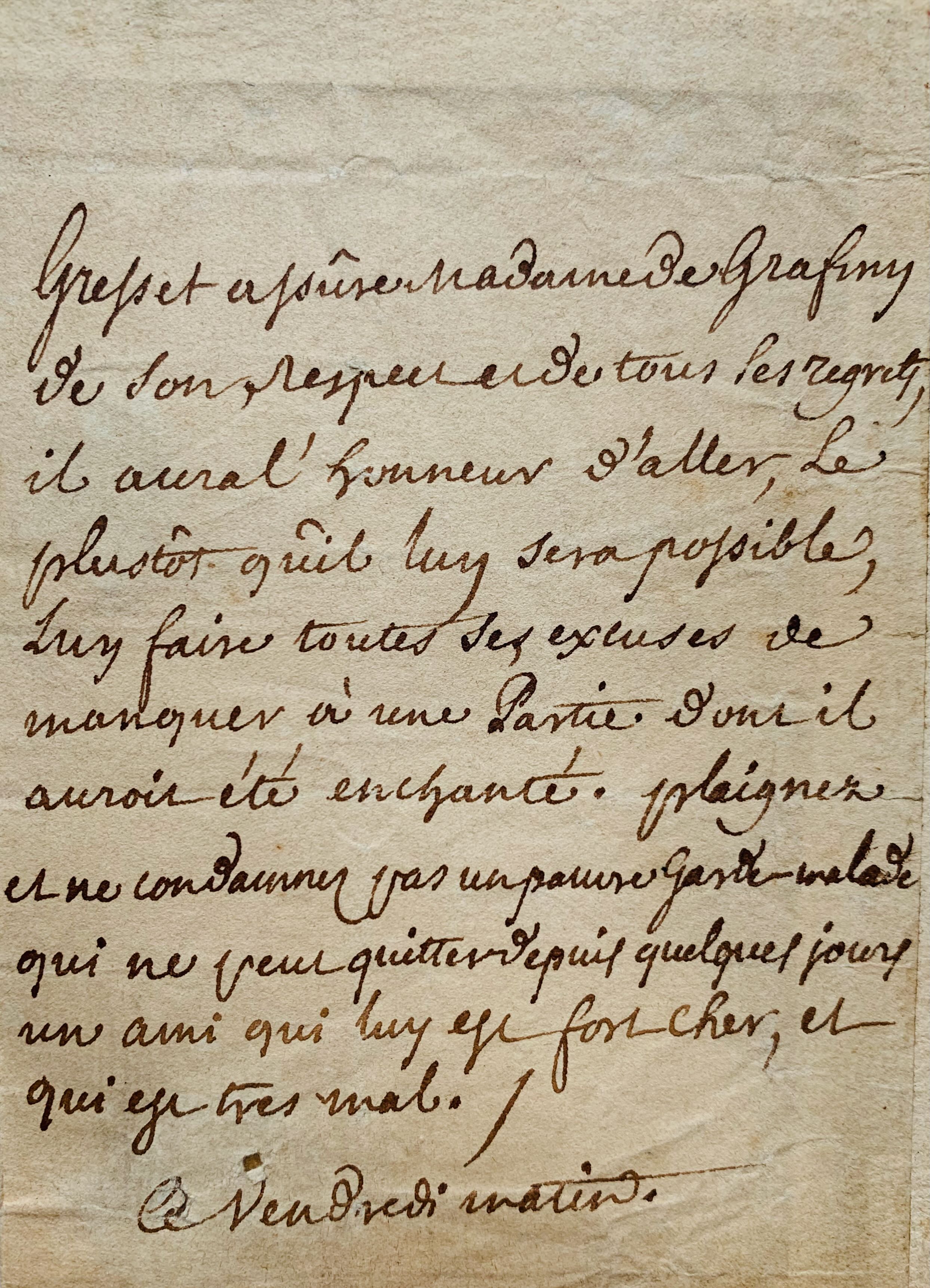 "Gresset assure à madame de Grafiny [sic] de son respect et de tous ses regrets, il aura l'honneur d'aller, le plus tôt qu'il lui sera possible, lui faire toutes ses excuses de manquer à une Partie dont il auroit été enchanté. Plaignez et ne condamnez pas un pauvre garde malade qui ne peut quitter depuis quelques jours un ami qui lui est fort cher et qui est très mal".