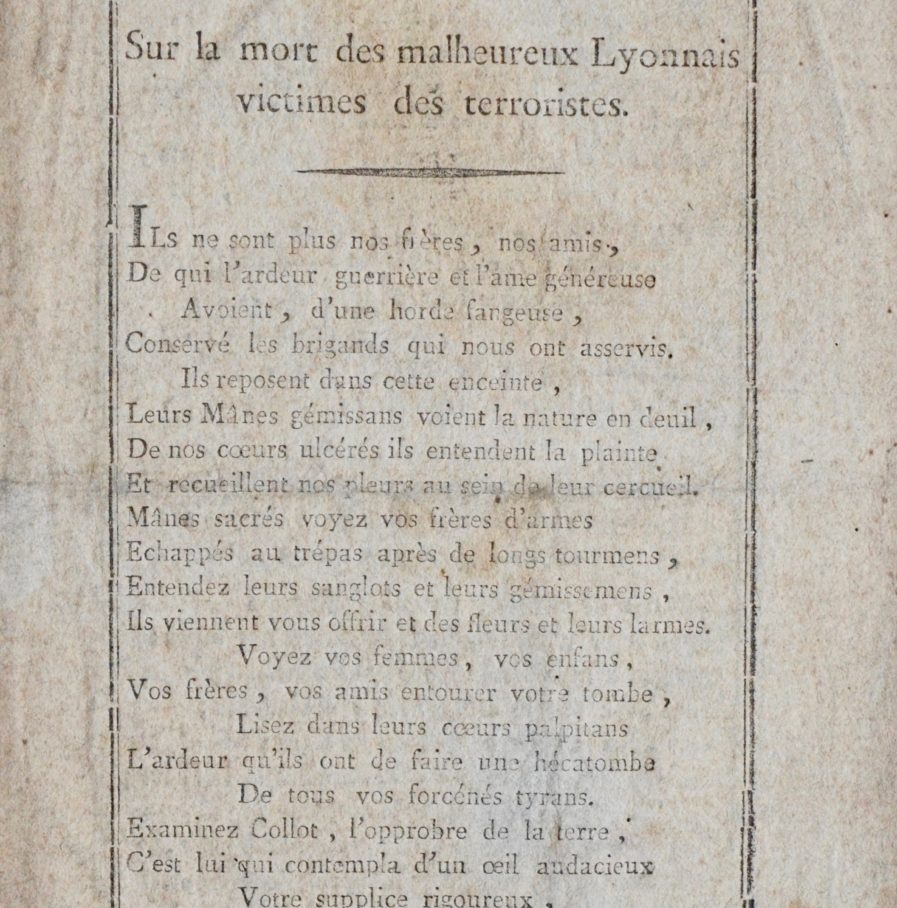 Rare imprimé révolutionnaire : « Élégie sur la mort des malheureux Lyonnais victimes des terroristes »