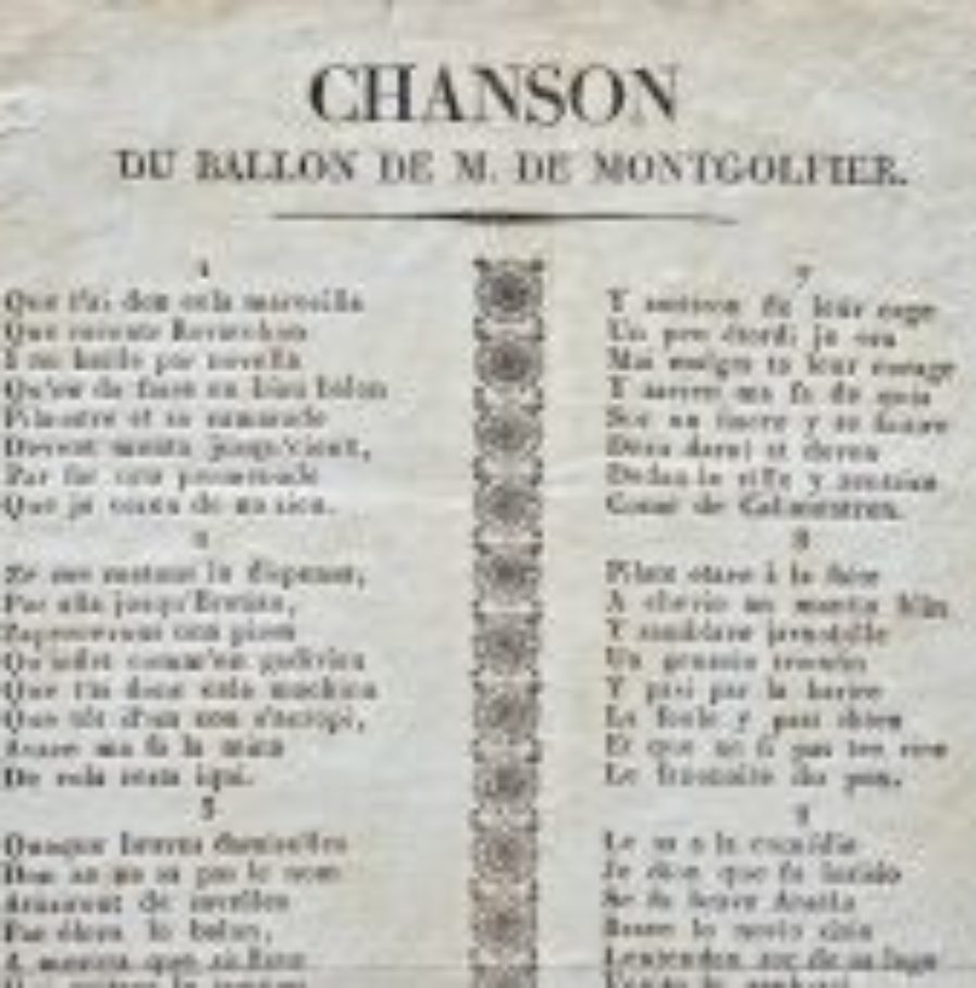 Très rare pièce imprimée en patois lyonnais sur l'ascension de Montgolfier et Pilâtre de Rozier, intitulée : "Chanson du ballon de M. de Montgolfier". « Que t'ai don cela marveilla / Que raconte Revarchon / I no baille novella / Qu'on da faire on biau balon [...] / Ze me metons in dispensa / Par alla jusqu'Brotiau [...] / Tot don coup ze vi parêtre / Pilaustre et de Mongorfi [...] ». Au total 96 vers.