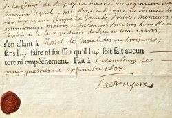 Bel en-tête avec grandes armes royales "La Bruyère, lieutenant pour le Roy, commandant au Gouvernement de Luxembourg". Cachet de cire rouge à ses armes.