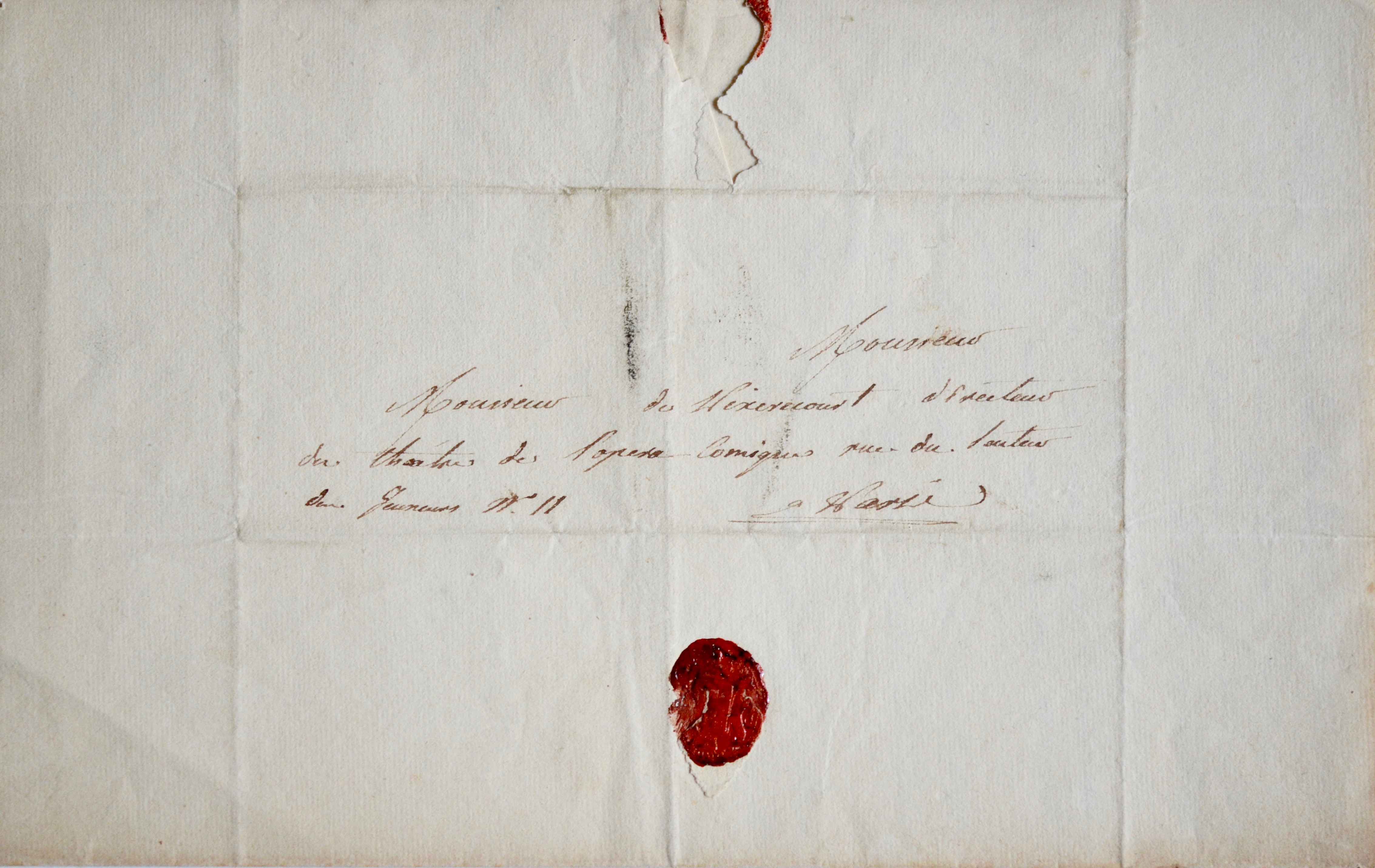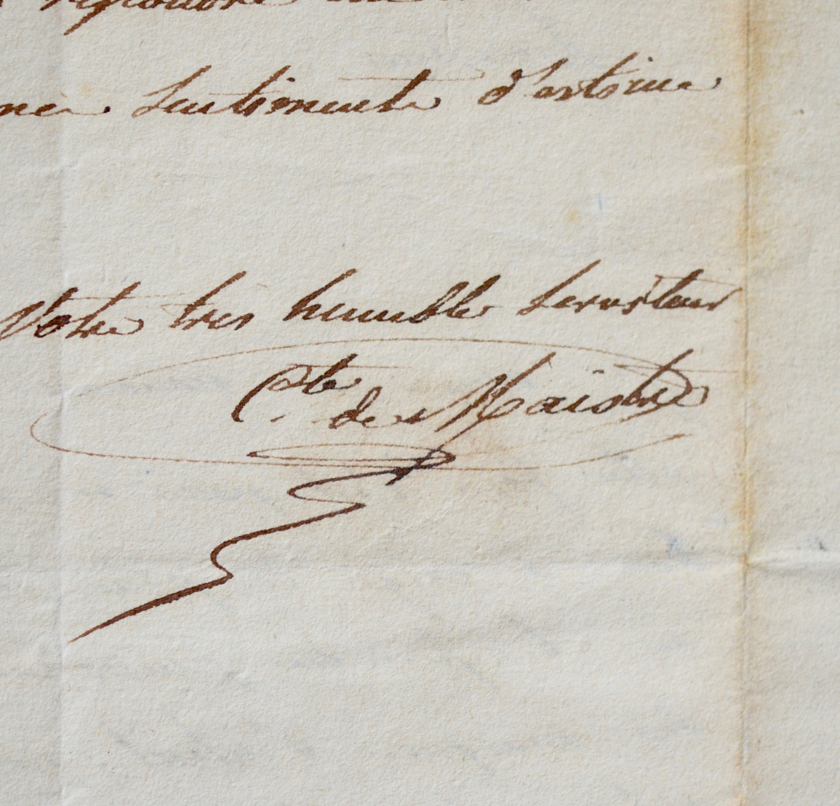 Lettre de Rodolphe, 3e comte de Maistre (1789-1866), fils de Joseph, officier au service du tsar et du roi de Sardaigne, signée « Cte de Maistre », adressée à Pixerécourt, directeur du Théâtre de l’Opéra-comique, pour manifester son mécontentement.