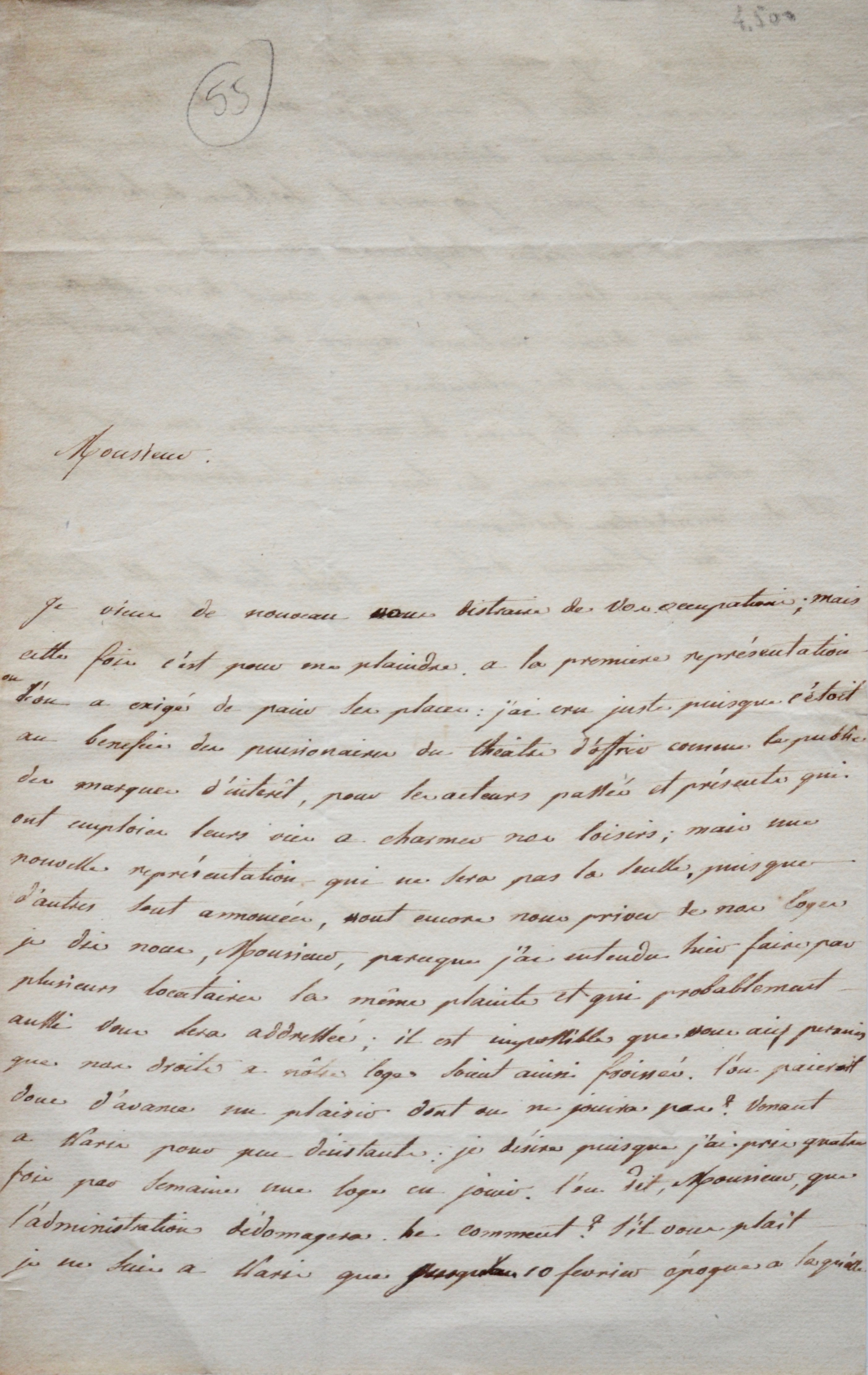 "Monsieur. Je viens de nouveau vous distraire de vos occupations ; mais cette fois c’est pour me plaindre. A la première représentation où l’on a exigé de paier sa place : j’ai cru juste puisque c’étoit au bénéfice des pensionnaires du théâtre d’offrir comme le public, des marques d’intérêt pour les acteurs passés et présents qui ont emploies leurs vies à charmer nos loisirs ; mais une nouvelle représentation qui ne sera pas la seulle, puisque d’autres sont annoncées, vont encore nous priver de nos loges. Je dis nous, Monsieur, parce que j’ai entendu hier faire par plusieurs locataires la même plainte et qui probablement aussi vous sera addressée ; il est impossible [...] que nos droits à nos loges soient ainsi froissés. [...] je désire, puisque j'ai pris quatre fois par semaine une loge, en jouir". A partir du 10 février il quittera Paris et ne demande pas de dédommagement, "mais je veux jouir de ce que j’ai payé".