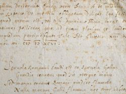 Fin d'une lettre en latin de Jacques Gillot à Scévole de Sainte-Marthe. Il lui annonce la mort de deux grands hommes, le nom du second seul demeure dans cette partie de lettre, le médecin Holierius, et en tire un mauvais présage. Il lui transmet un poème latin de François Juret, érudit originaire de Dijon (1553-1626) et conseiller au Parlement de Paris, à sa gloire, roulant sur l'homonymie avec Mucius Scevola, le héros romain qui brûla sa main pour avoir manqué son attentat contre Porsenna, roi étrusque . En voici la traduction.