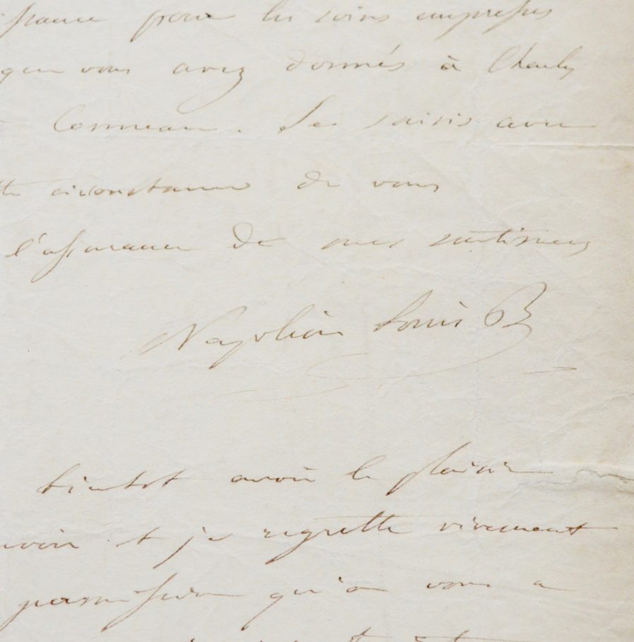« Monsieur. Je vous prie d’accepter les billets ci-joints comme une faible marque de ma reconnaissance pour les soins empressés et habiles que vous avez donnés à Charles Thélin et à Conneau […]. J’espère bientôt avoir le plaisir de vous revoir et je regrette vivement que la permission qu’on vous a accordée ait été si restreinte ».