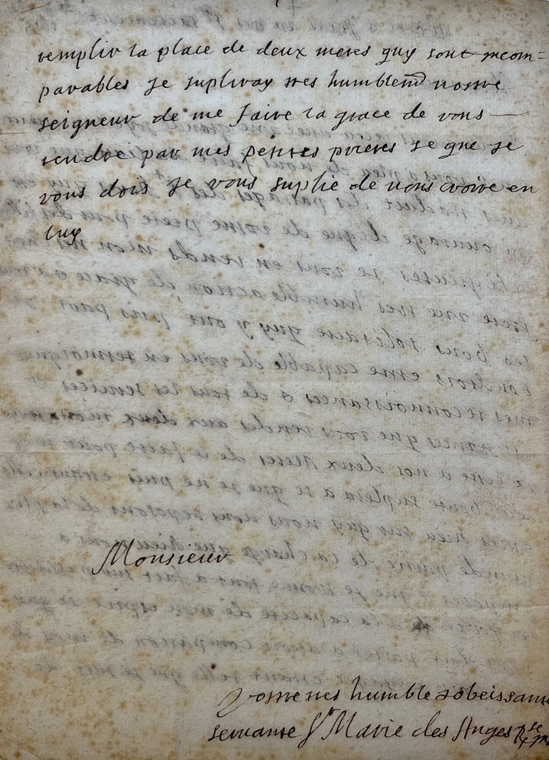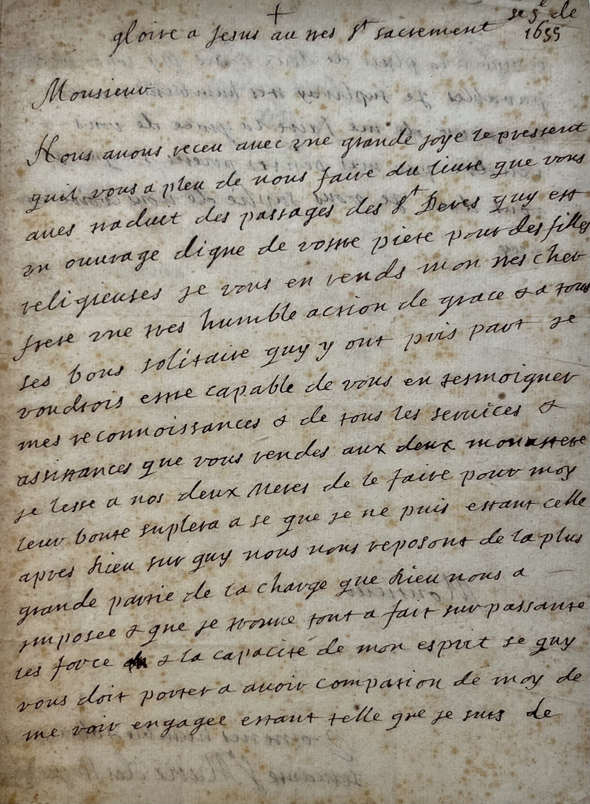 « Monsieur. Nous avons receu avec une grande joye le present quil vous a pleu de nous faire du livre que vous aves traduit des passages des St Peres qui est un ouvrage digne de vostre piete pour des filles religieuses je vous en rends mon très cher frère une très humble action de grâce et à tous les bons solitaires qui y ont pris part je voudrois estre capable de vous en temoigner mes reconnoissances et de tous les services et assistances que vous rendes aux deux monastères. Je lesse à nos deux mères [Mère Angélique et Mère Agnès] de le faire pour moy leur bonte suplera a se que ne puis estant celles apres Dieu sur quy nous nous reposons de la plus grande partie de la charge que Dieu nous a imposee et que je trouve tout a fait surpassante les forces et la capacité de mon esprit se quy nous doit porter à avoir compassion de moy de me voir engager estant telle que je suis de remplir la place de deux mères quy sont incomparables [...] ».