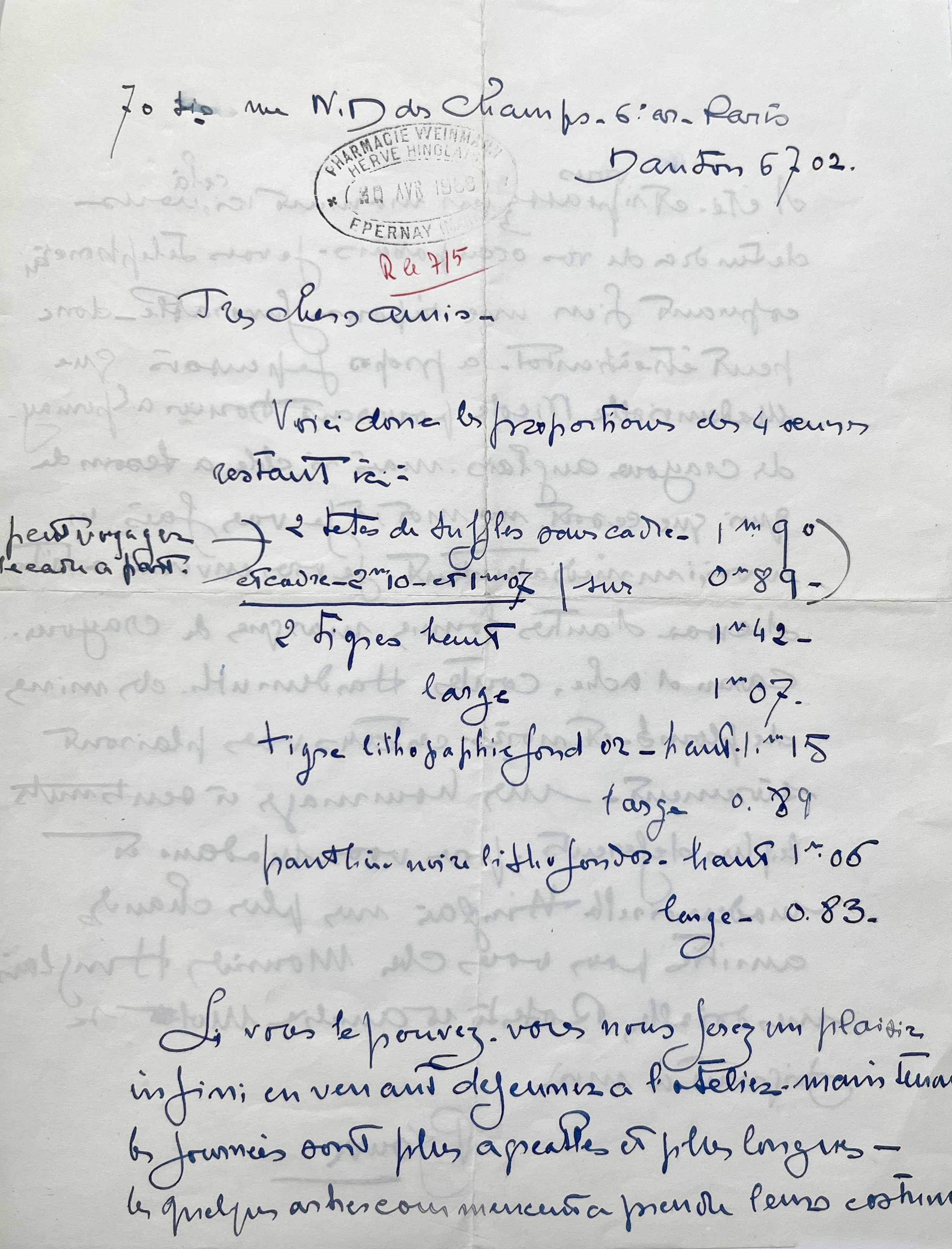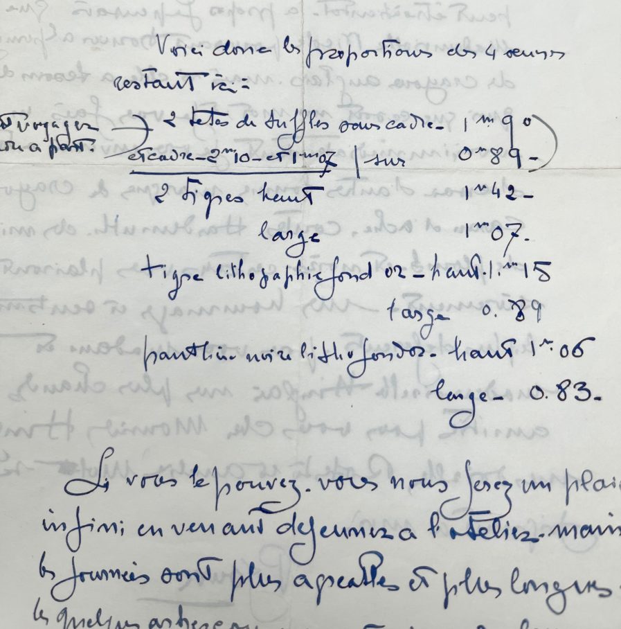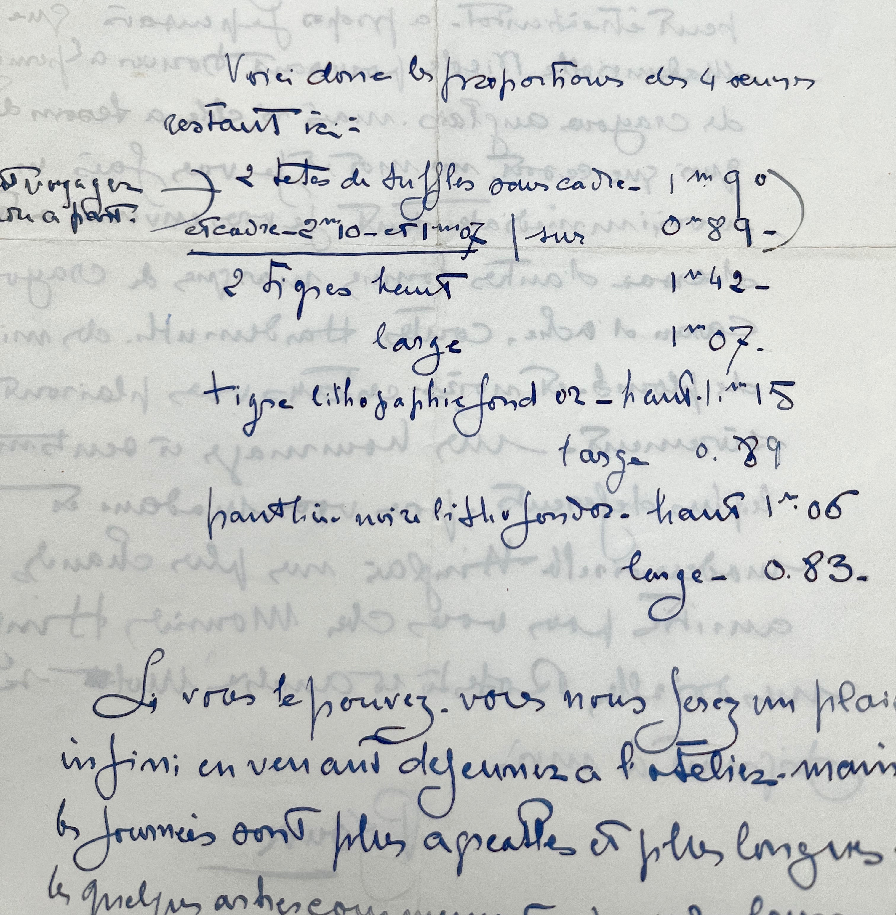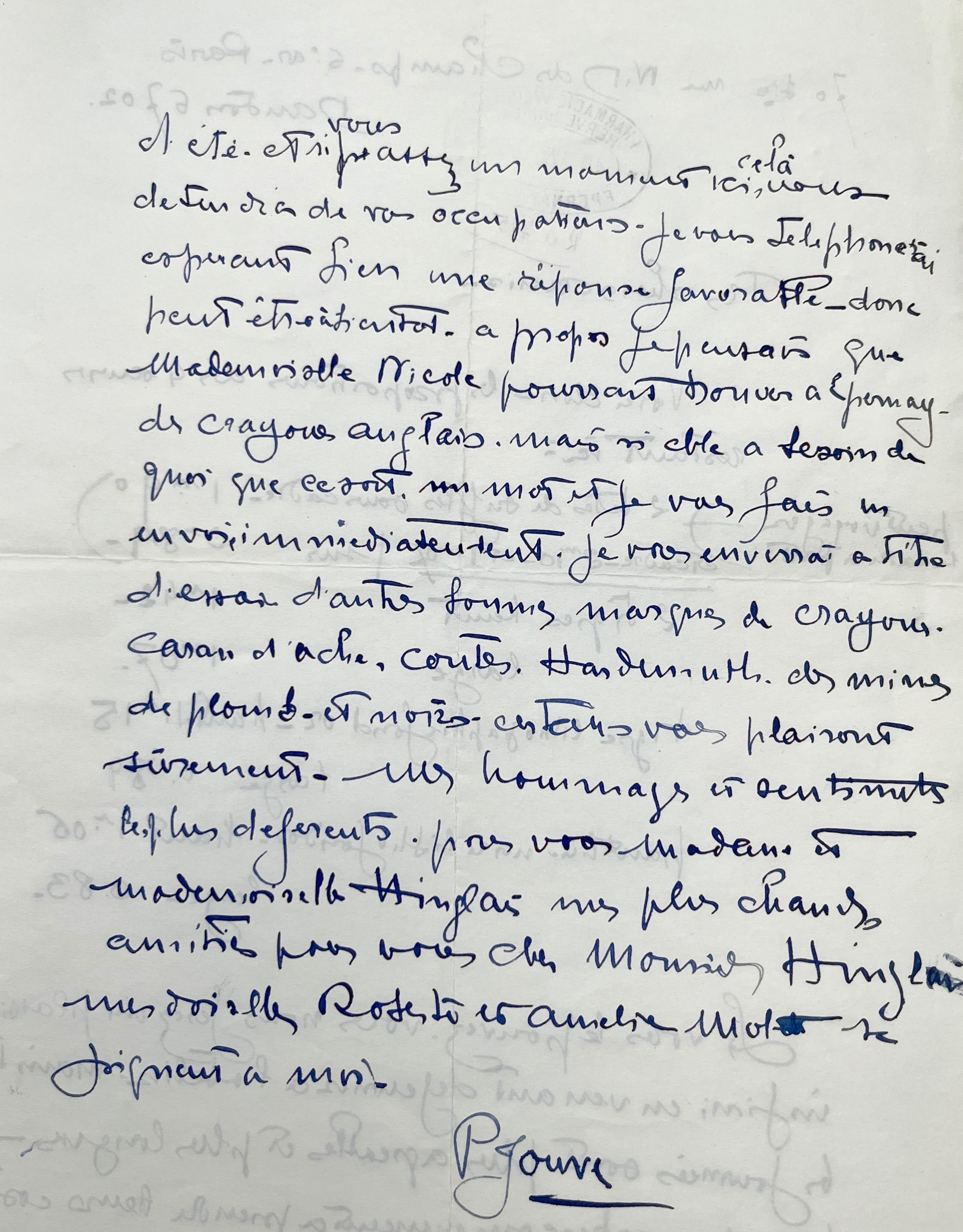 Il convie Hinglais à venir déjeuner à son atelier. "Maintenant les journées sont plus agréables et plus longues. Les quelques arbres commencent à prendre leurs costumes d'été". Il lui demande de lui procurer des crayons anglais. Je vous enverrai à titre d'essai d'autres bonnes marques de crayons Caran d'Ache, Conté, Hardemuth, des mines de plomb - et noirs - certains vous plairont surement [...]".