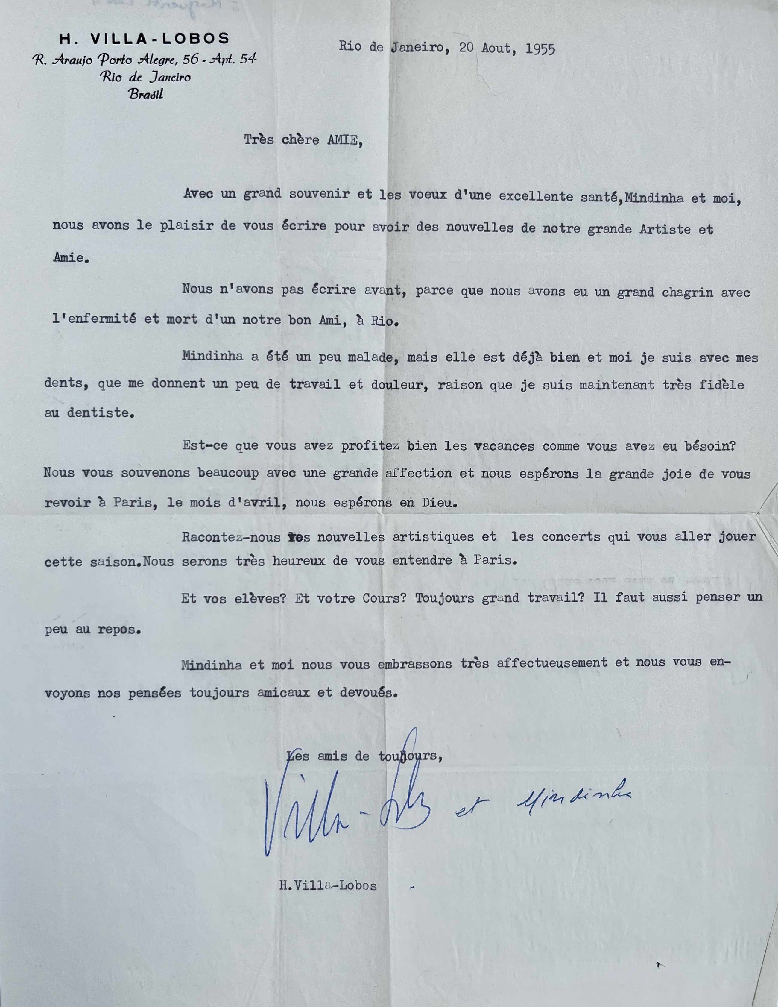 "Très chère AMIE, Avec un grand souvenir et les voeux d'une excellente santé, Mindinha et moi, nous avons le plaisir de vous écrire pour avoir des nouvelles de notre grande Artiste et Amie. Nous n'avons pas écrire avant, parce que nous avons eu un grand chagrin avec l'enfermité et mort d'un notre bon Ami, à Rio. Mindinha a été un peu malade, mais elle est déjà bien et moi je suis avec mes dents, que me donnent un peu de travail et douleur, raison que je suis maintenant très fidèle au dentiste. Est-ce que vous avez profitez bien les vacances comme vous avez eu bésoin ? Nous vous souvenons beaucoup avec une grande affection et nous espérons la grande joie de vous revoir à Paris, le mois d'avril, nous espérons en Dieu. Racontez-nous vos nouvelles artistiques et les concerts qui vous aller jouer cette saison. Nous serons très heureux de vous entendre à Paris. Et vos élèves ? Et votre cours ? Toujours grand travail ? Il faut aussi penser un peu au repos. Mindinha et moi nous vous embrassons très affectueusement et nous vous envoyons nos pensées toujours amicaux et devoués".