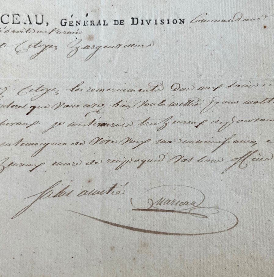Rare lettre du général Marceau, deux mois avant sa mort