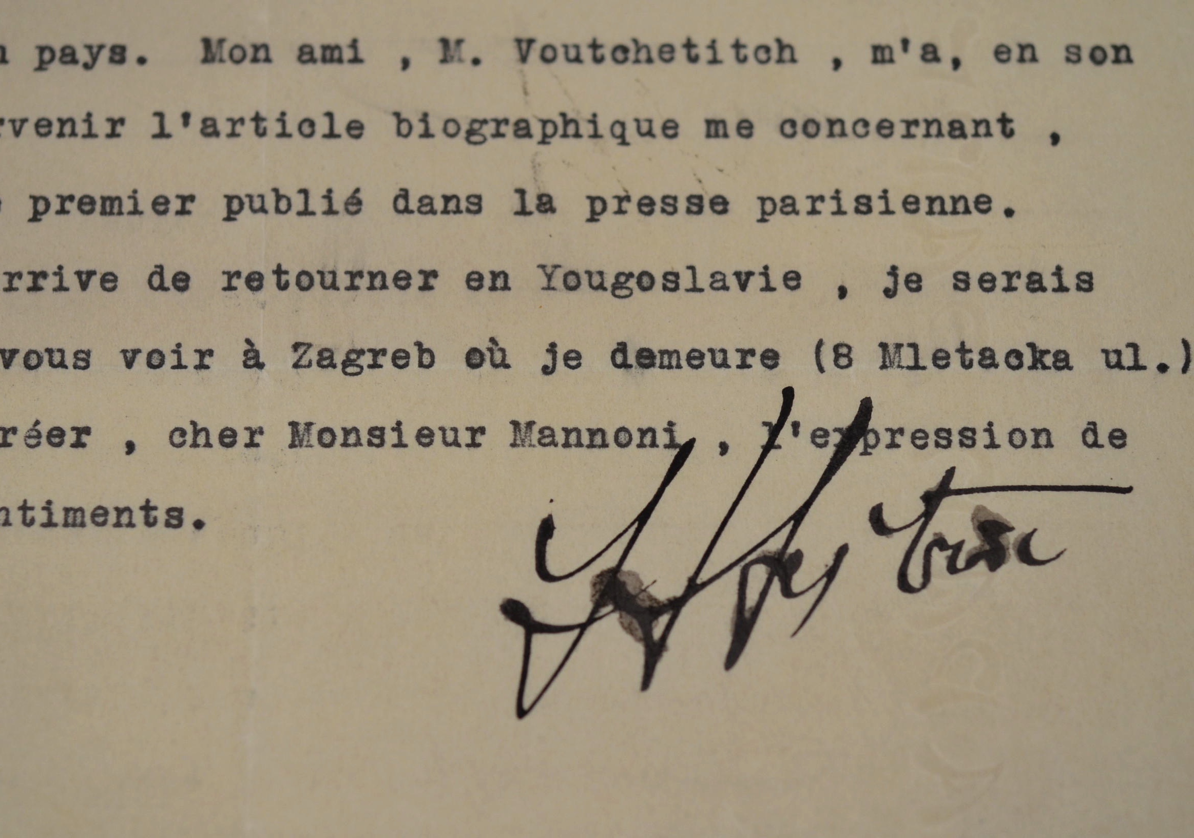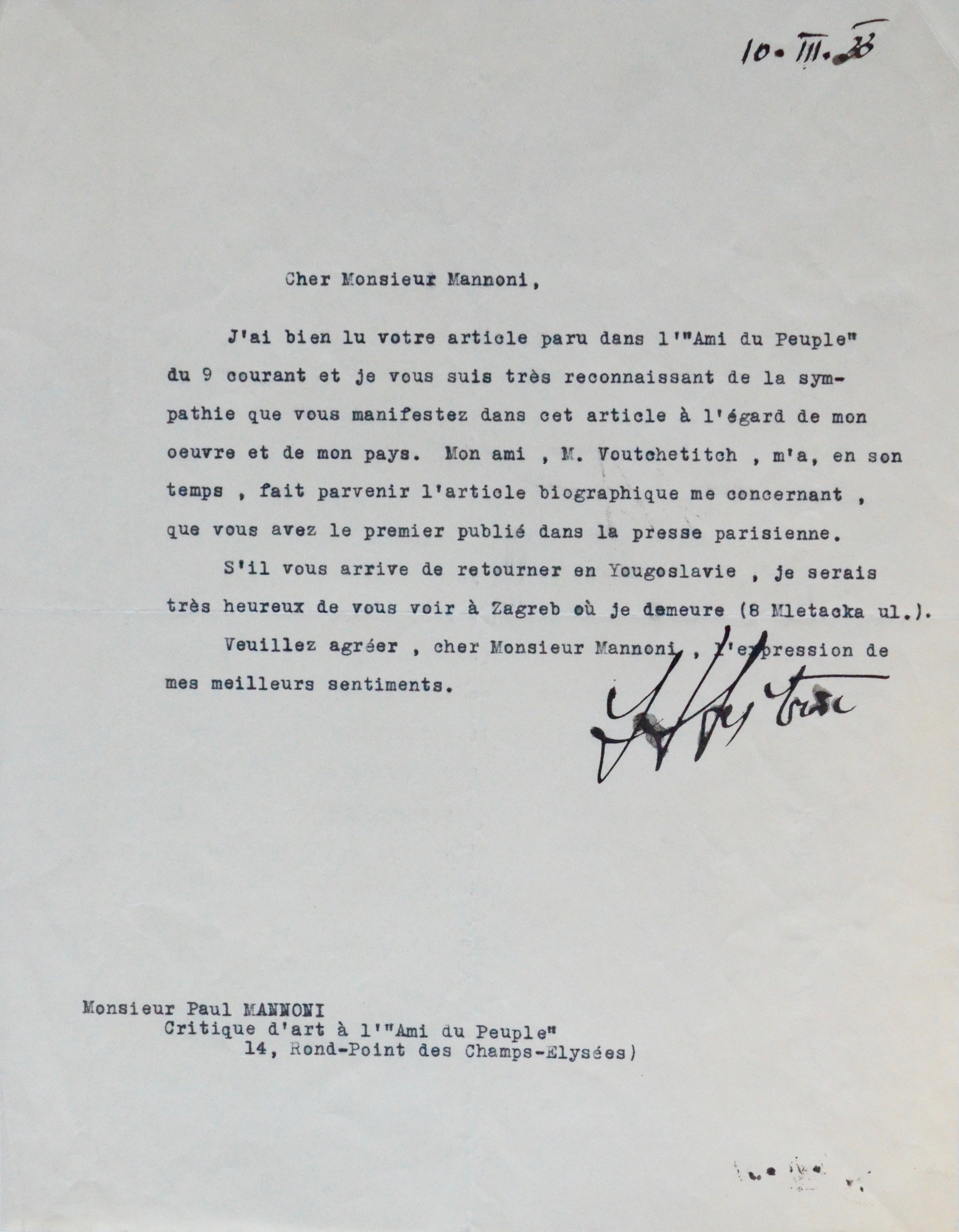 "J'ai bien lu votre article paru dans "l'Ami du Peuple" du 9 courant et je vous suis très reconnaissant de la sympathie que vous manifestez dans cet article à l'égard de mon oeuvre et de mon pays. Mon ami, M. Voutchetitch [Evgueni (1908/1974), sculpteur soviétique], m'a, en son temps, fait parvenir l'article biographique me concernant, que vous avez le premier publié dans la presse parisienne". Il l'invite à le voir en Yougoslavie, et donne son adresse à Zagreb, 8 Mletacka Ulica [où était son atelier et où est aujourd'hui le musée qui lui est consacré].