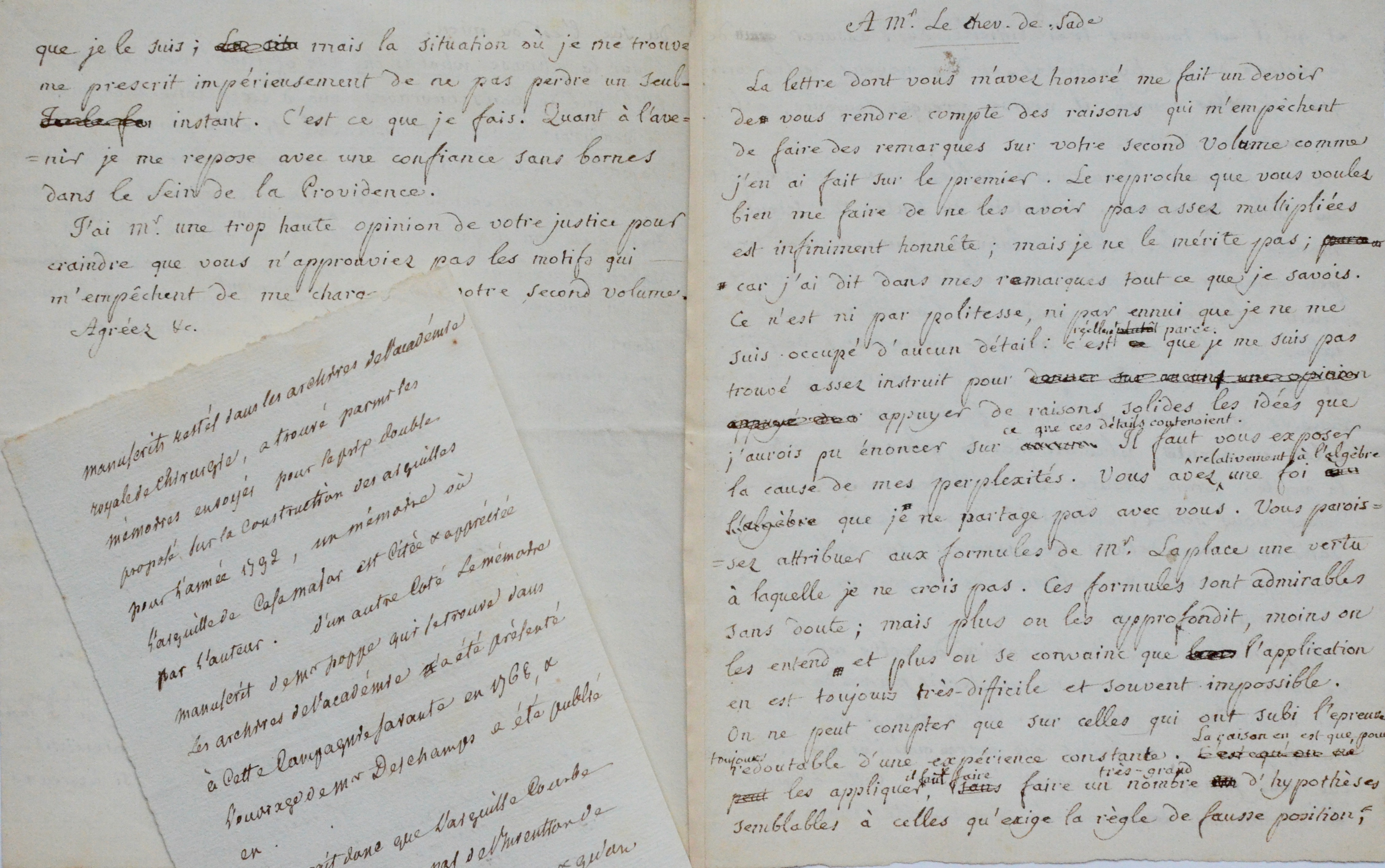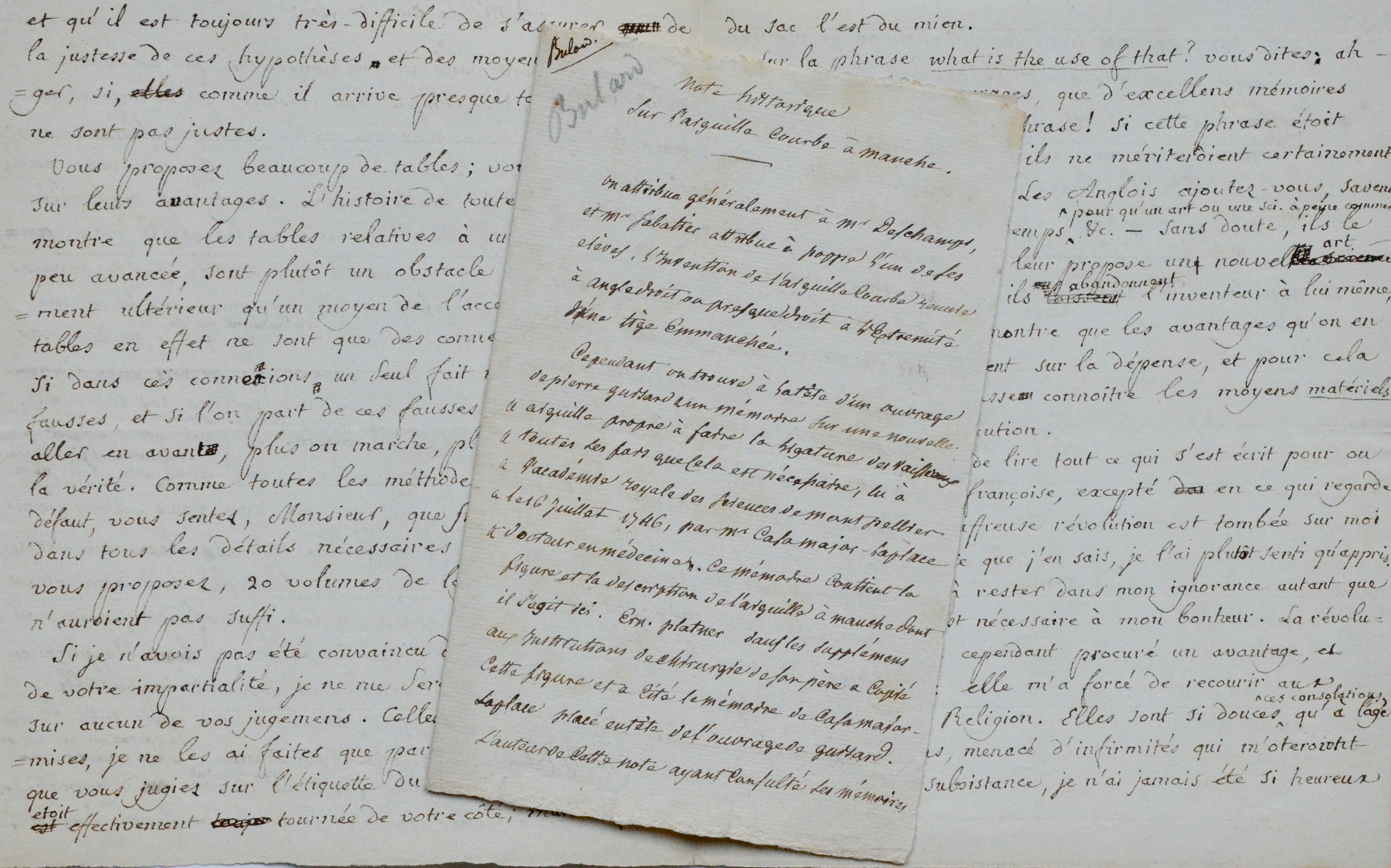 On joint une note signée «AB» d'un auteur non identifié, fin XVIIIe-début XIXe, 2 pp. in-8, intitulée: «Note historique sur l'aiguille courbe à manche», concluant: «il paraît donc que l'aiguille emmanchée n'est pas de l'invention de Chappe ni de Mr Deschamps et qu'on doit en rapporter l'invention à casa major Laplace».