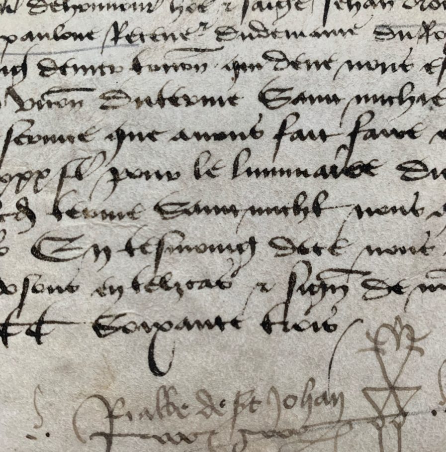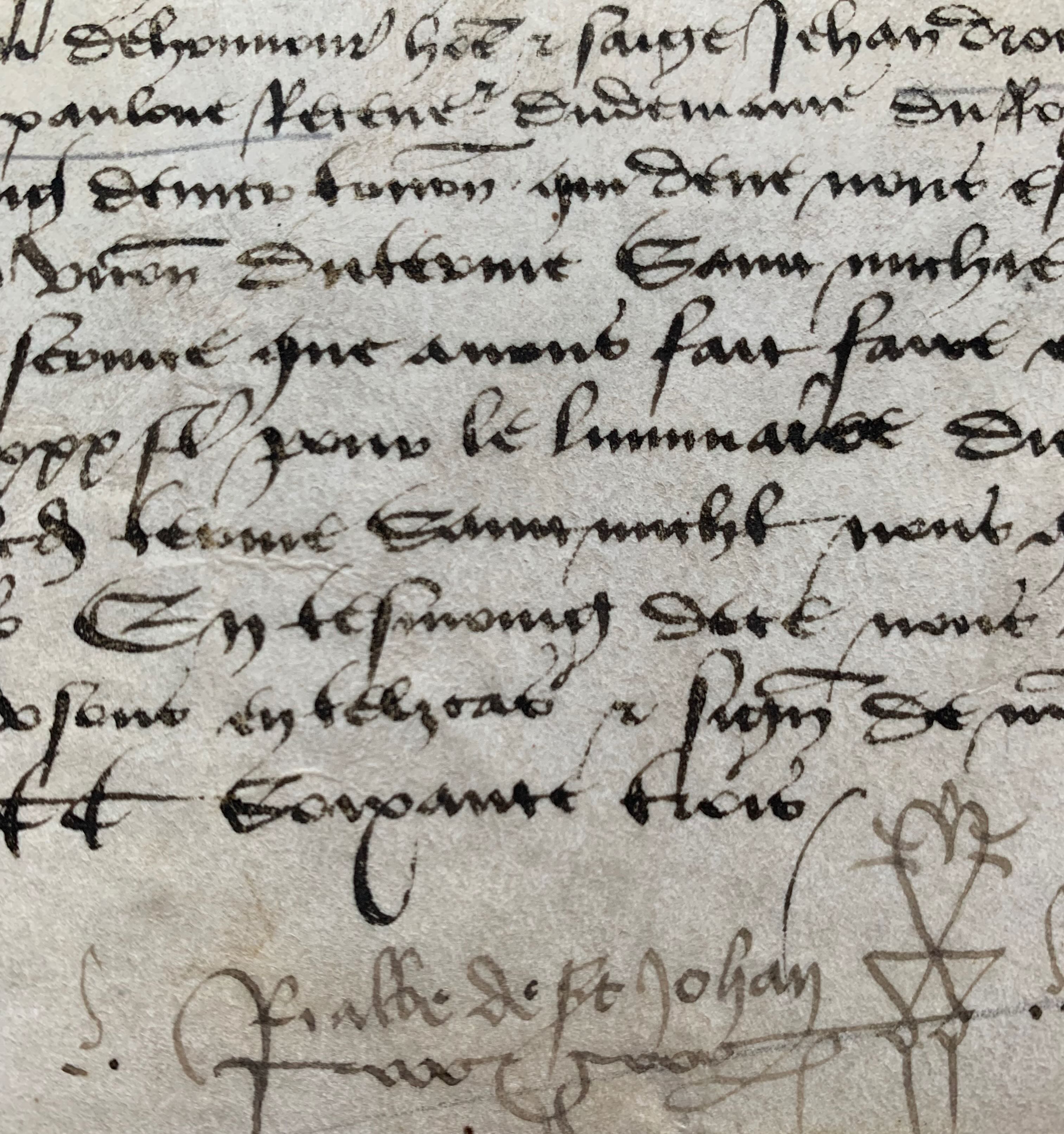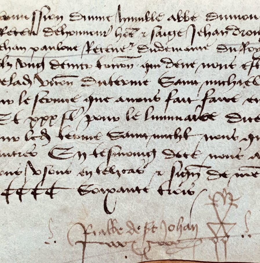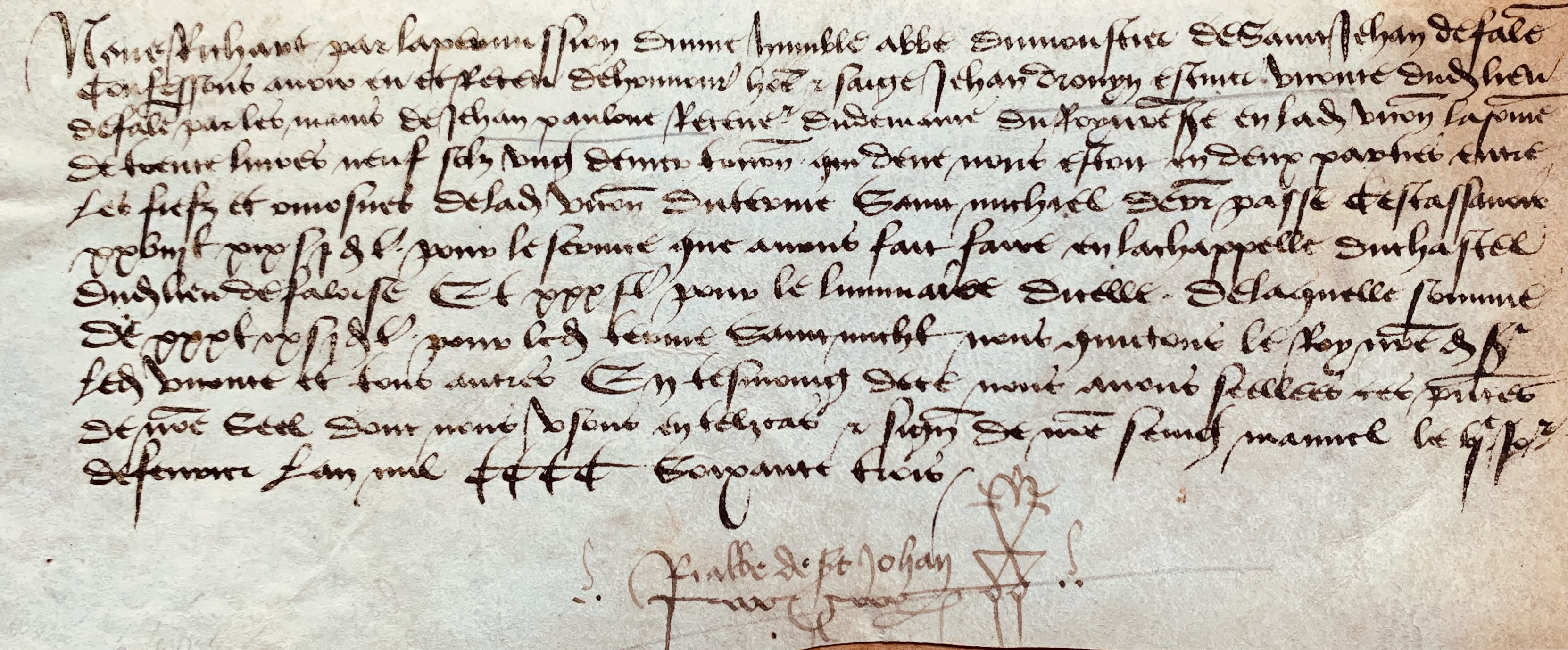 Pièce signée « R. abbé de St Johan » [Richard DES LANDES, fut abbé de Saint-Jean de Falaise, de 1452 à 1469].