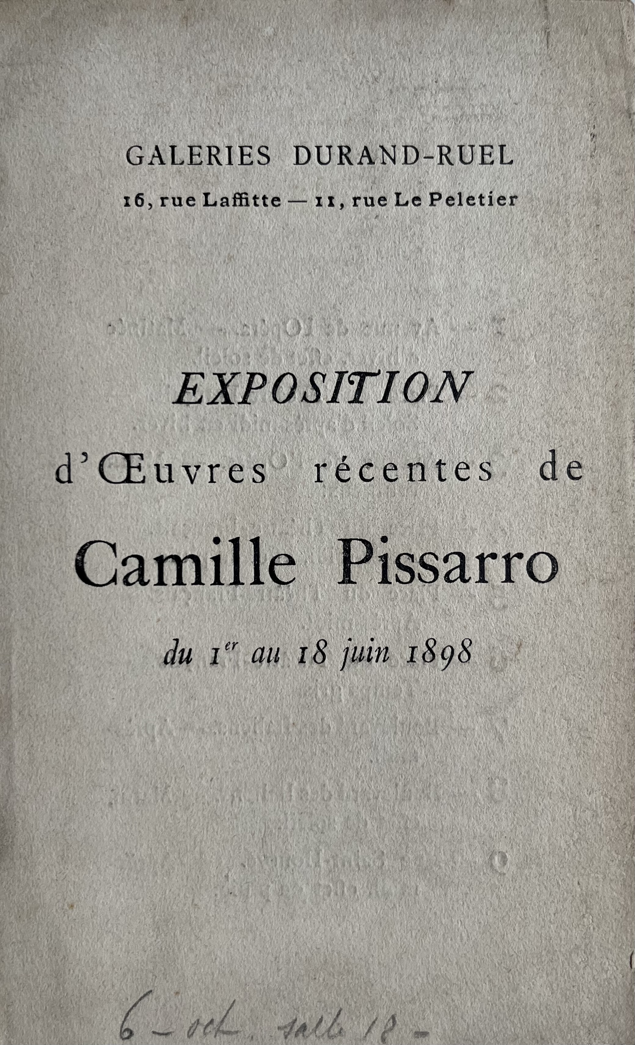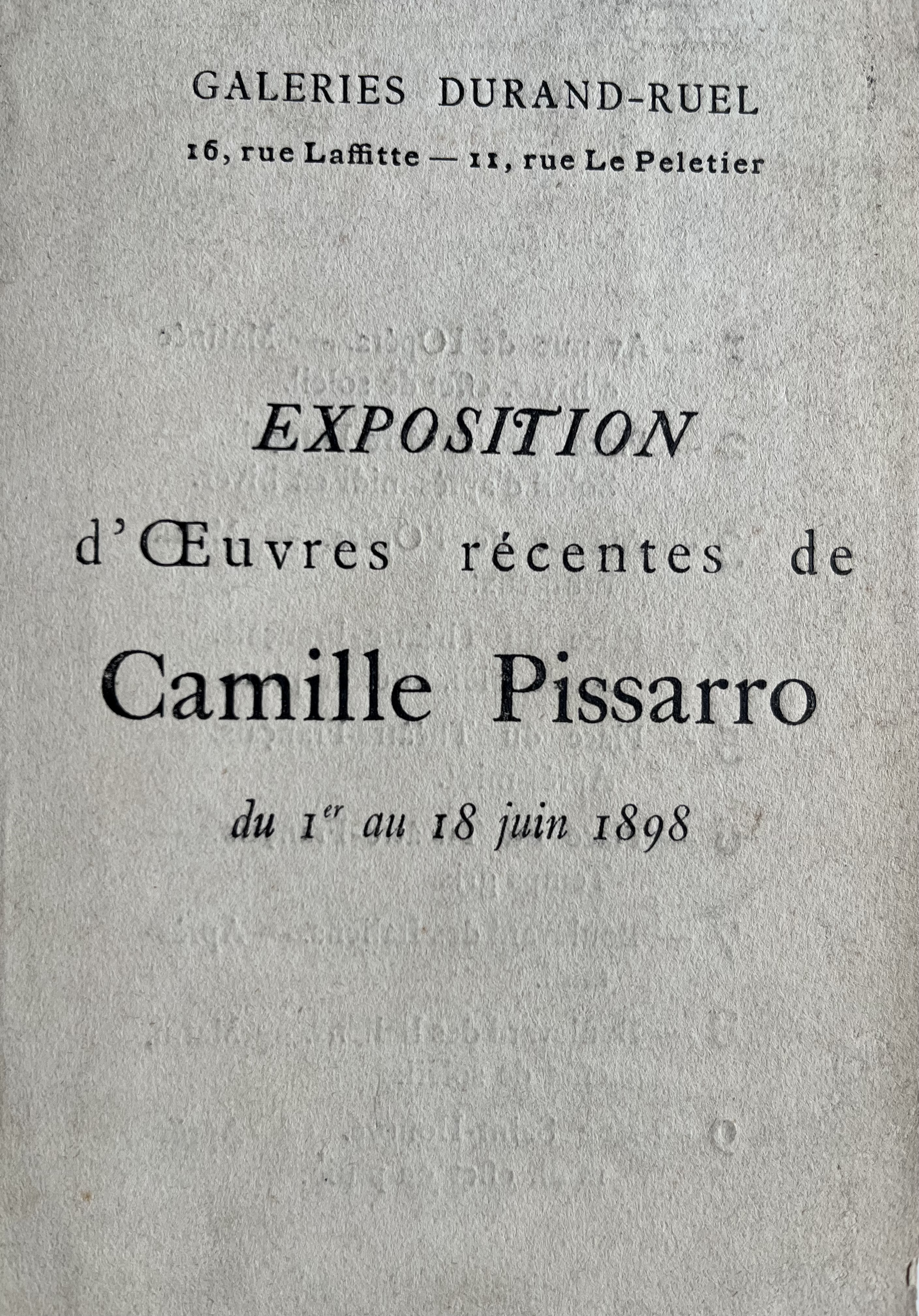 Camille Pissarro (île de Saint-Thomas, Antilles danoises, 1830/1903)Petite plaquette imprimée : "Galeries Durand-Ruel - 16, rue Laffitte - 11, rue Le Peletier. Exposition d'oeuvres récentes de Camille Pissarro du 1er au 18 juin 1898".