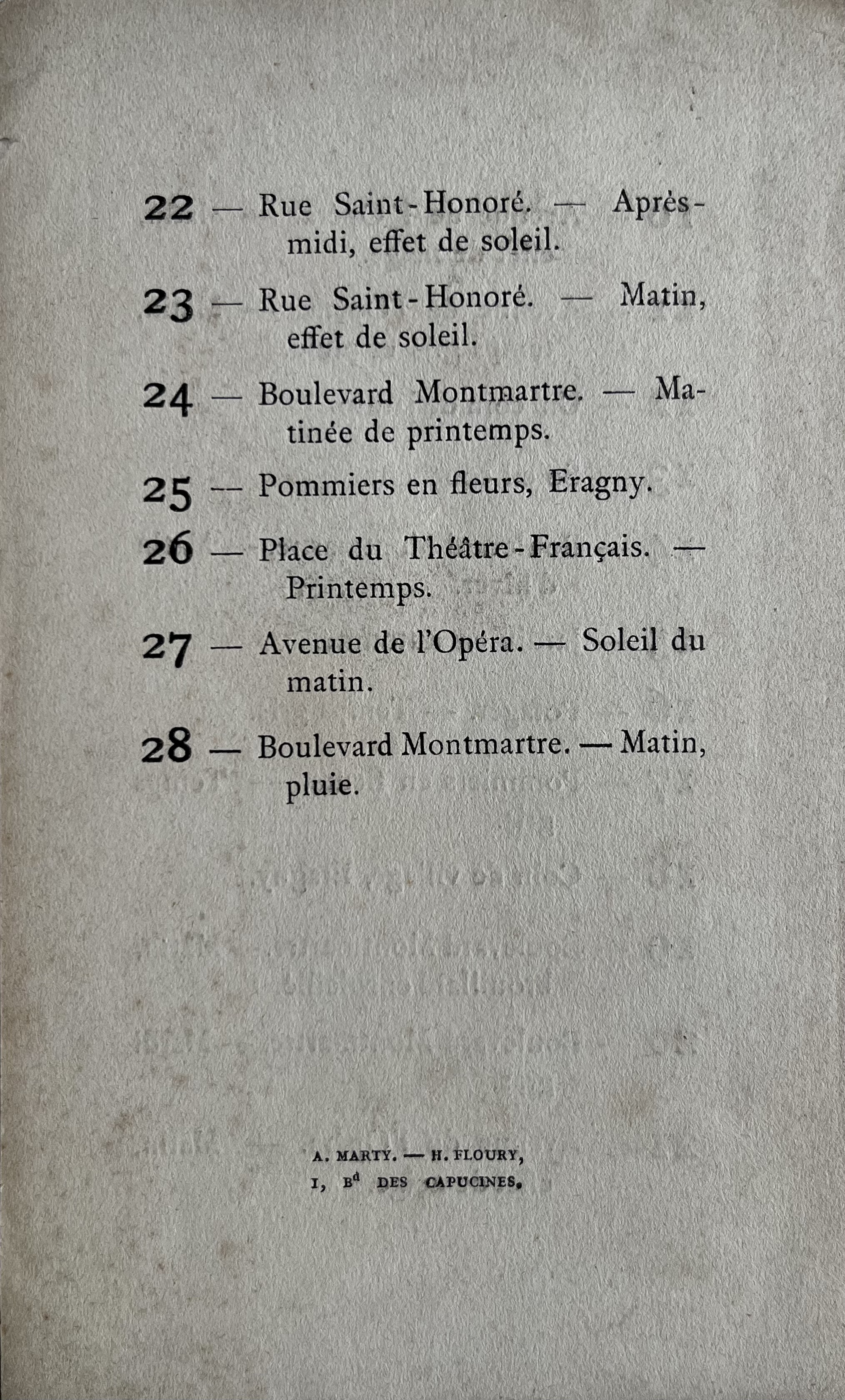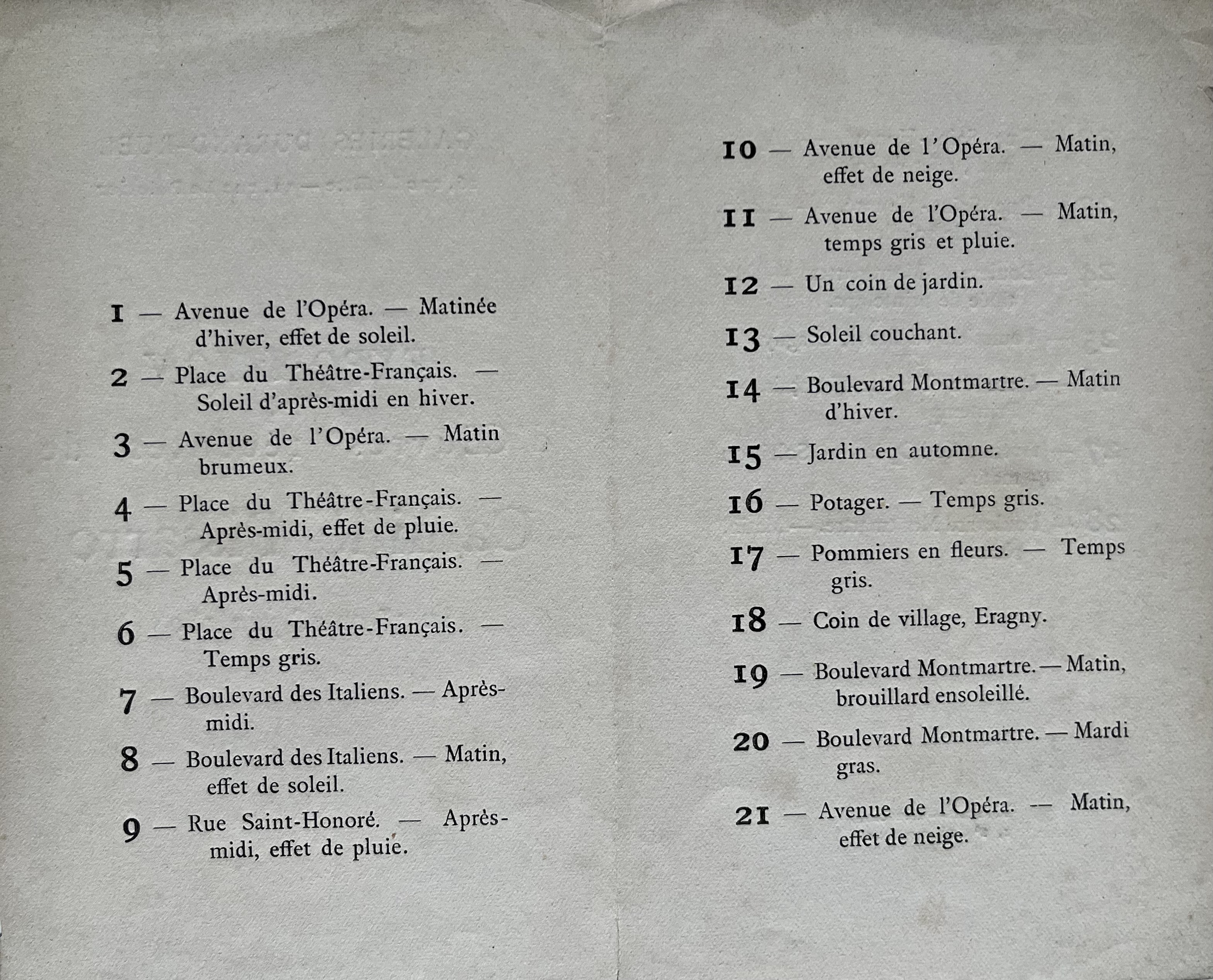 Sont listés 28 tableaux, dont bon nombre de vues de Paris : "Avenue de l'Opéra. - Matinée d'hiver, effet de soleil" ; "Place du Théâtre-Français. Soleil d'après-midi en hiver" ; "Boulevard des Italiens. Matin, effet de soleil" ; "Rue Saint-Honoré. Après-midi, effet de pluie" ; "20 - Boulevard Montmartre. - Mardi gras", etc.