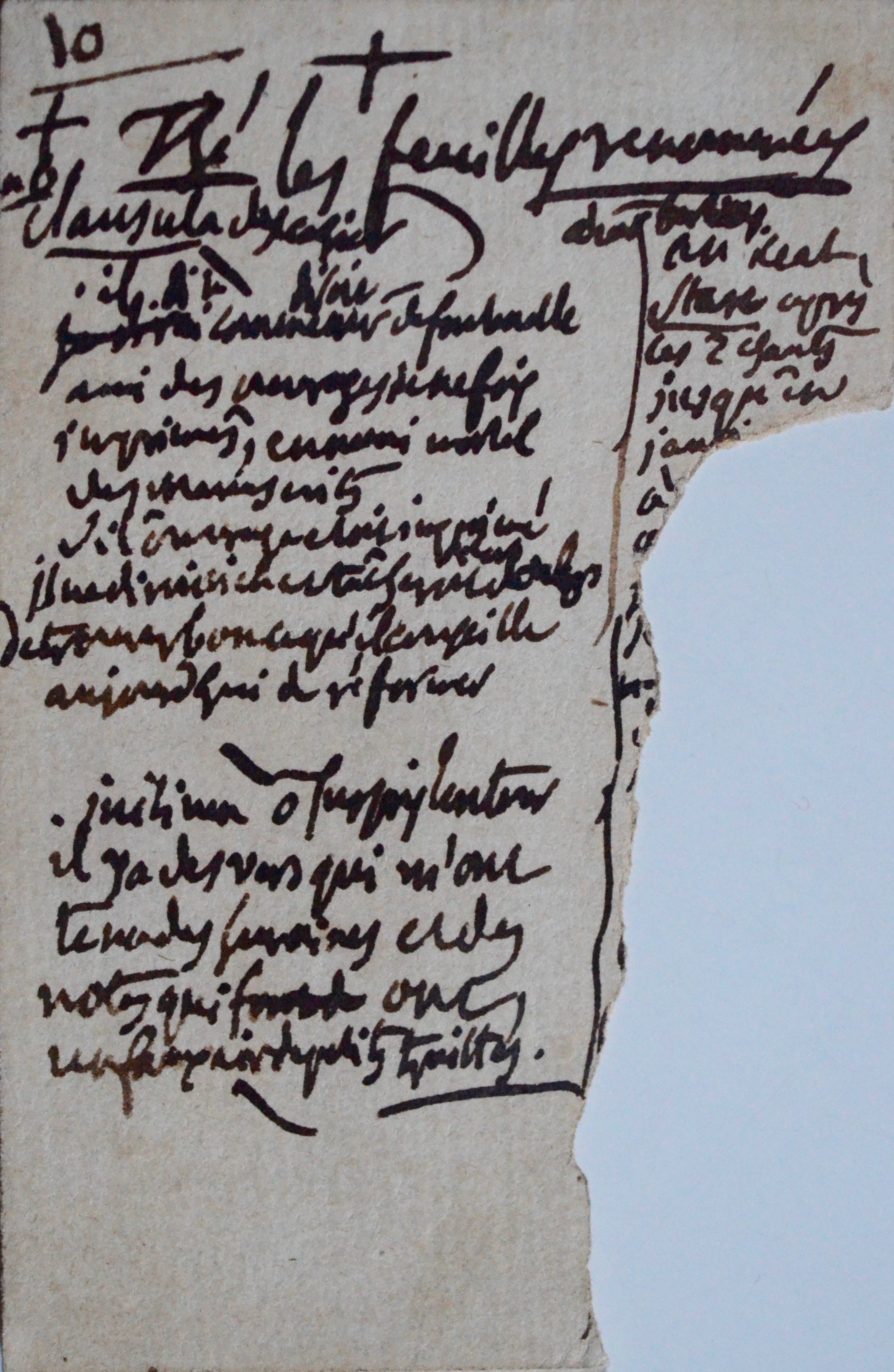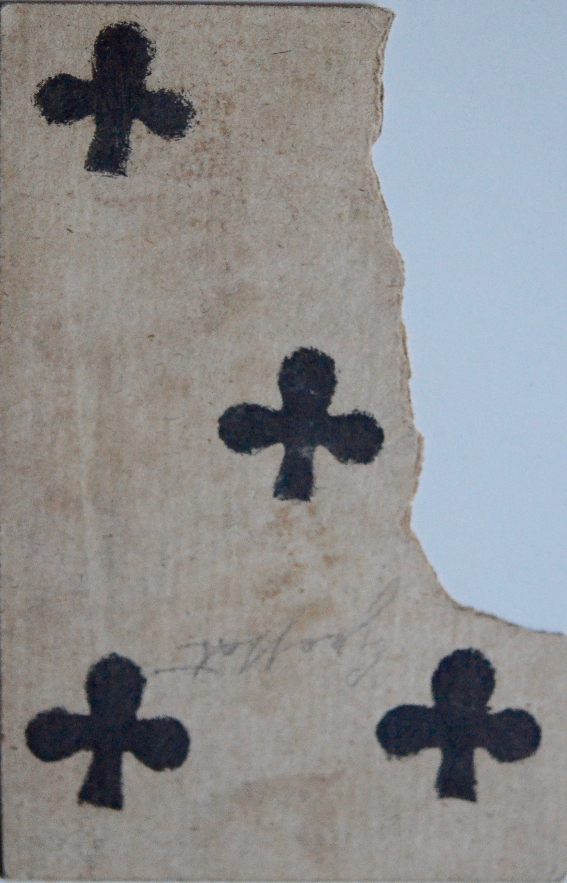 Encre brune sur carte à jouer composée de trois feuillets (à recoller) de papier vergé, un filigrane feuille de lys.