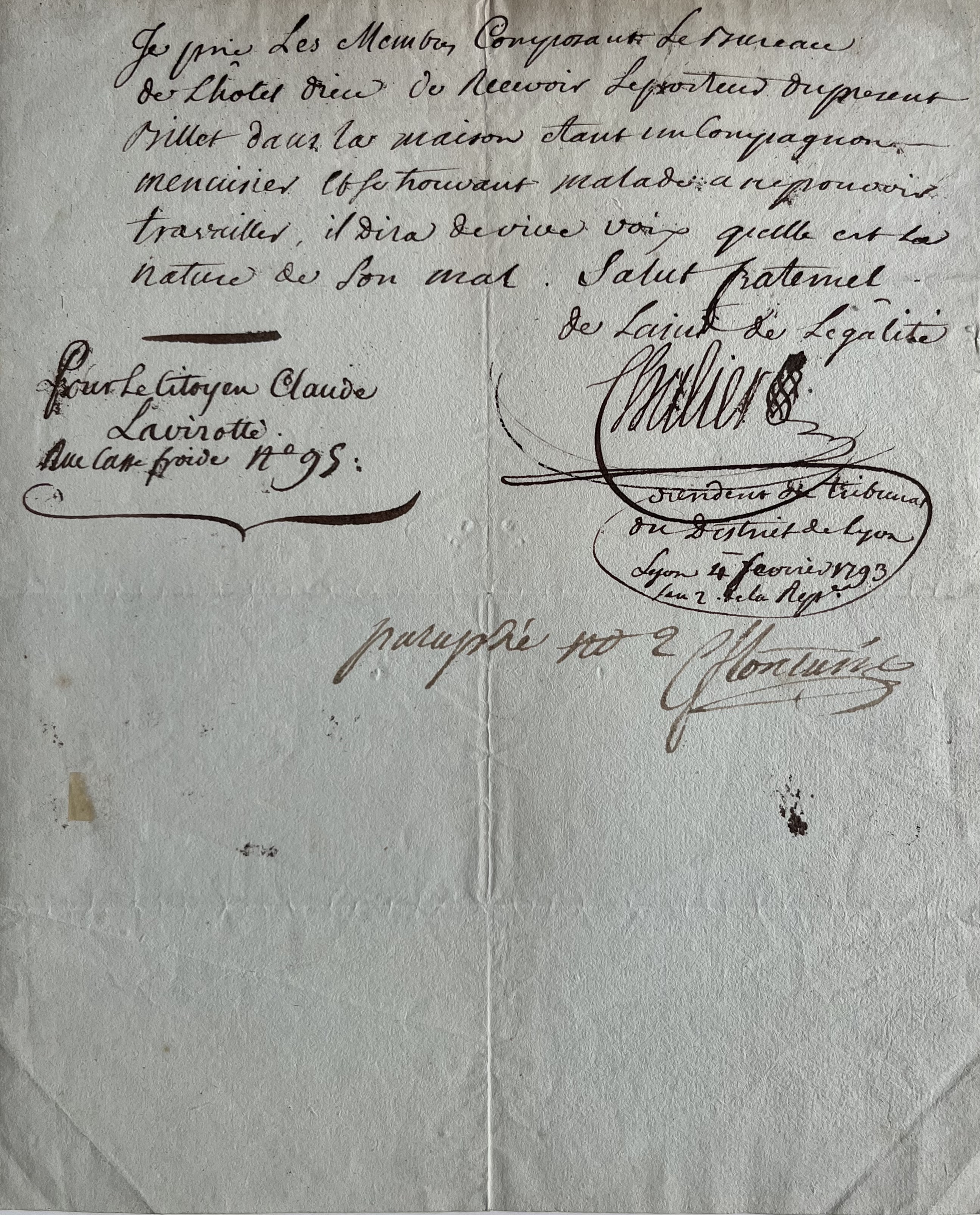 « Je prie les membres composant le bureau de l'Hôtel Dieu de recevoir le porteur du présent billet dans la maison étant un compagnon menuisier et se trouvant malade à ne pouvoir travailler. Il dira de vive voix quelle est la nature de son mal. Salut fraternel de l'ami de l'égalité».