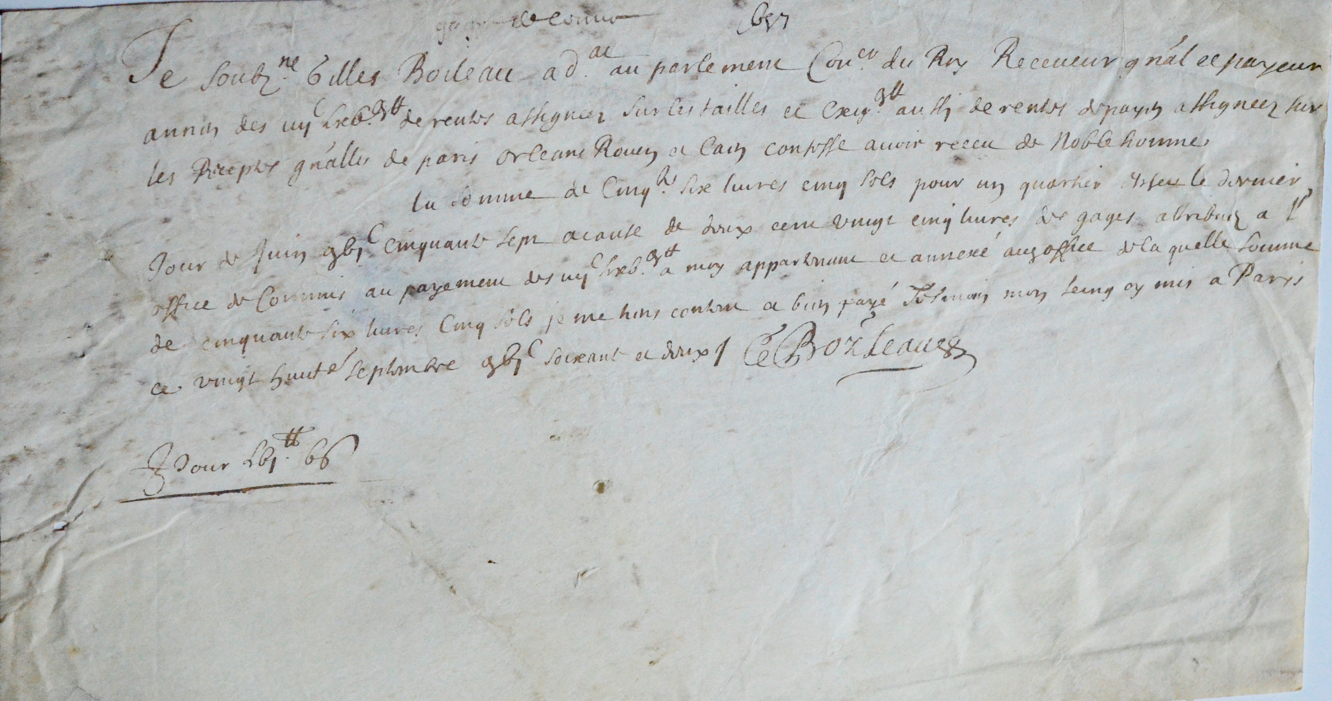 Belle pièce signée du poète Gilles Boileau (1631-1669), contrôleur de l'argenterie du Roi et frère aîné de Nicolas Boileau-Despréaux.