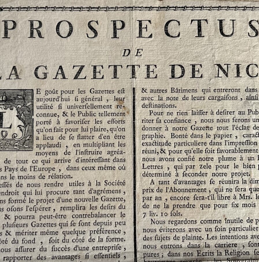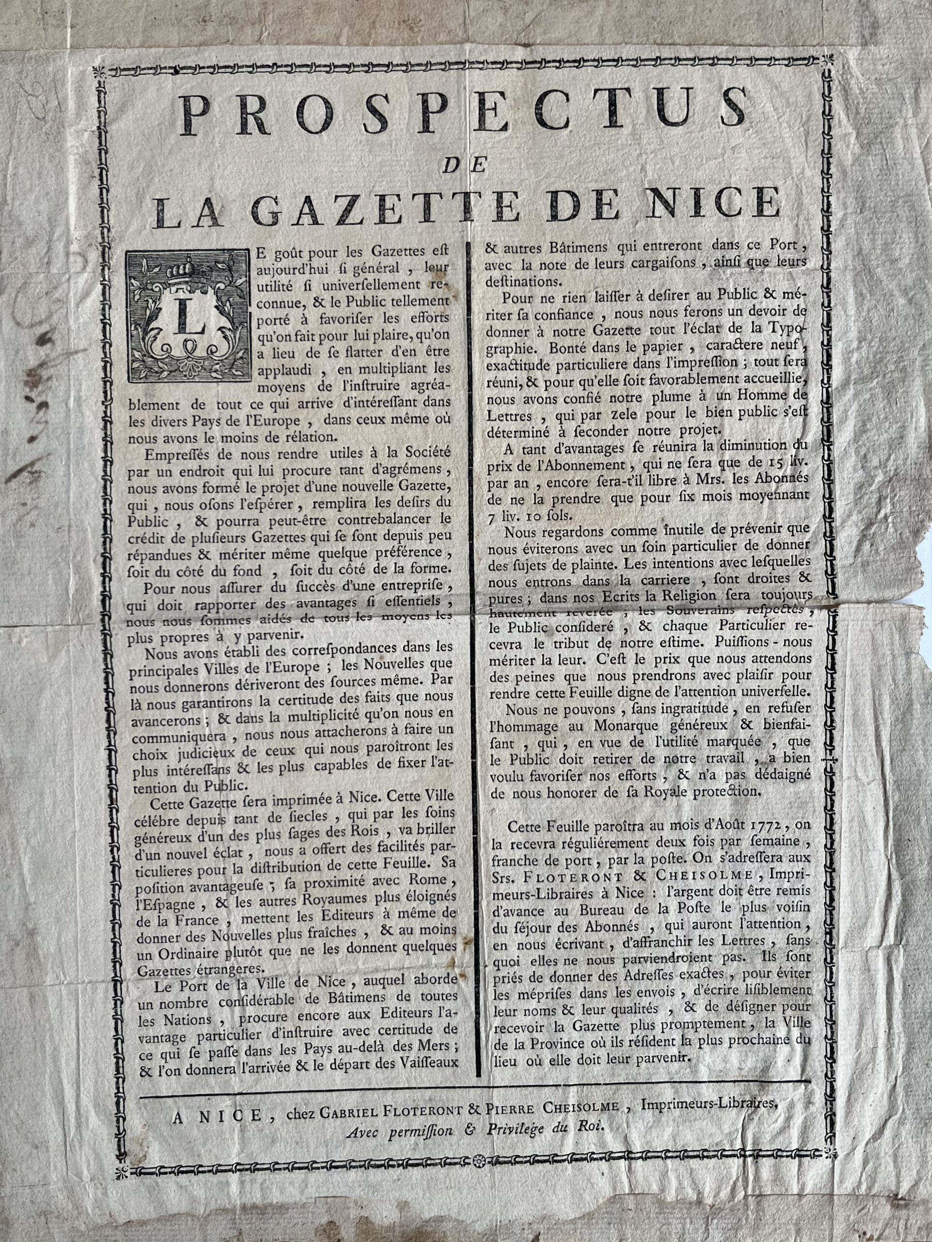 Rare affichette intitulée « prospectus de la Gazette de Nice », annonçant la parution de ce périodique fondé en 1772 par Pierre-Joseph Cheisolme (1718-1792), réfugié à Nice, et qui fut supprimé en 1774 ou 1775.