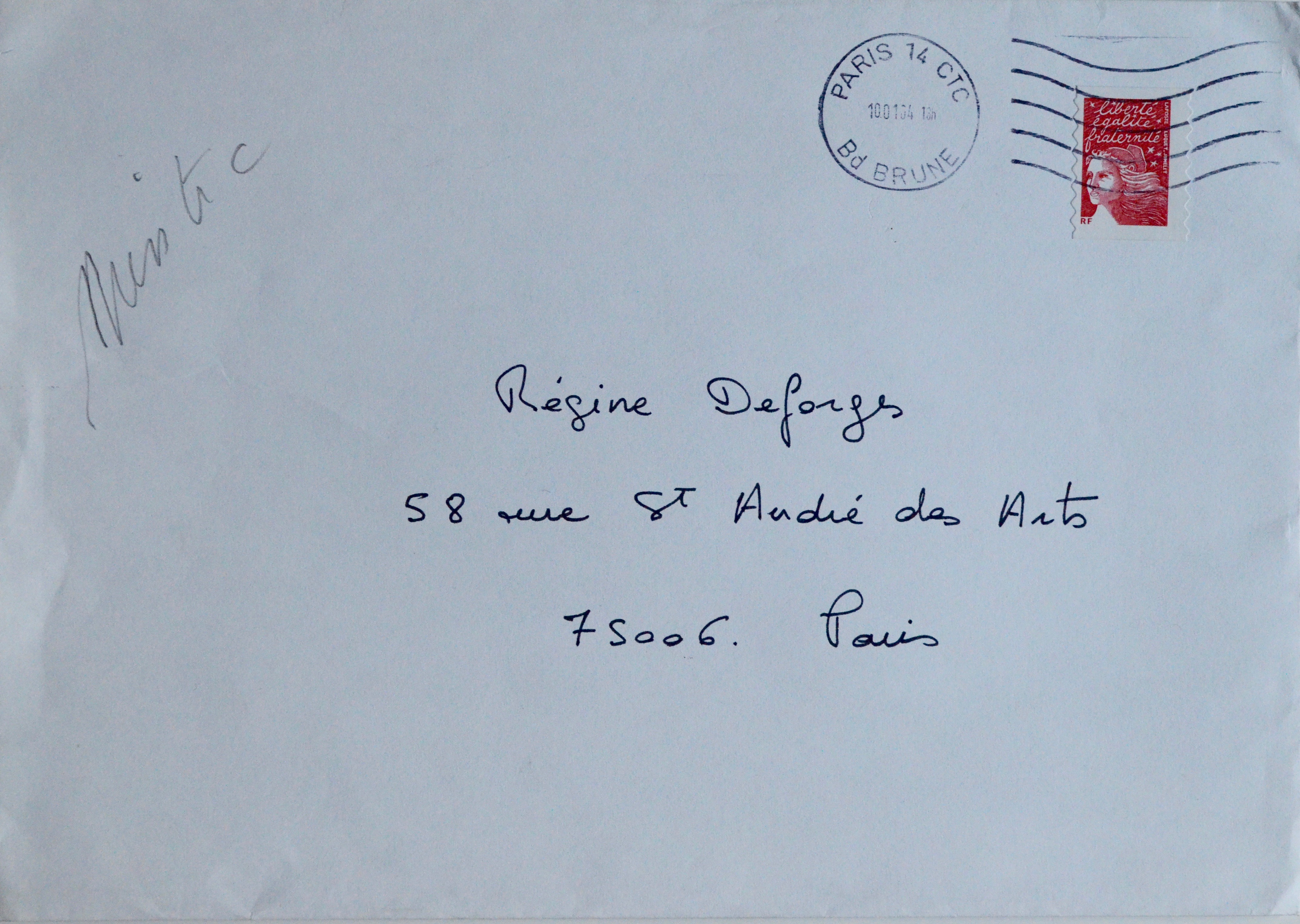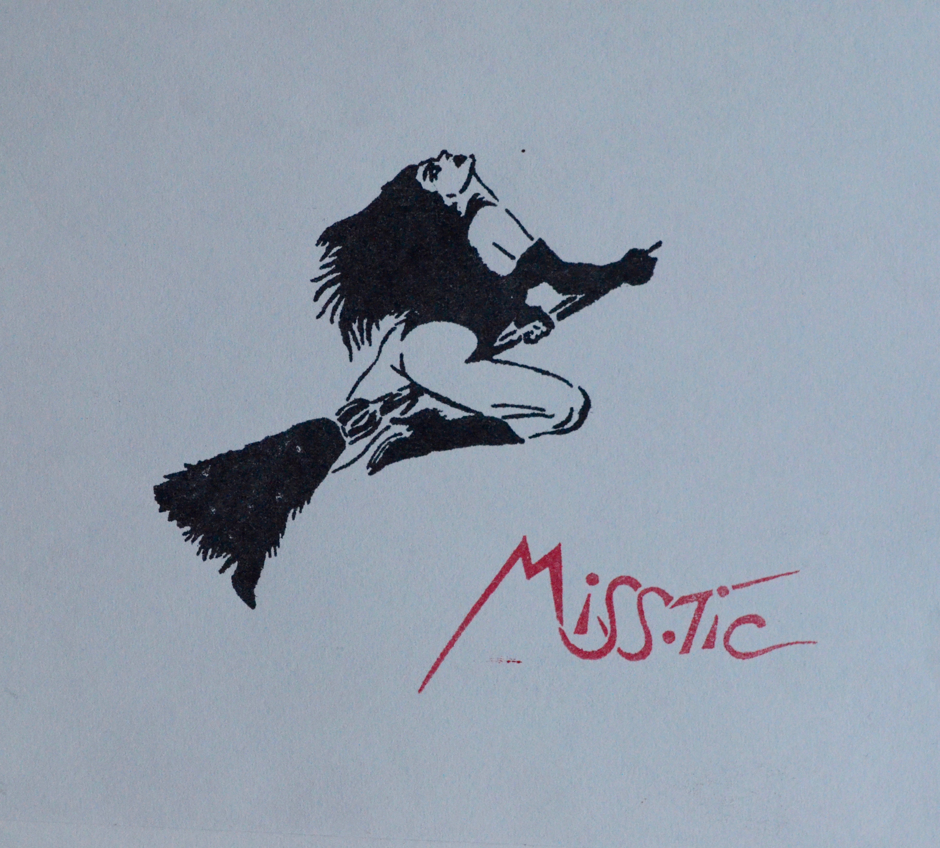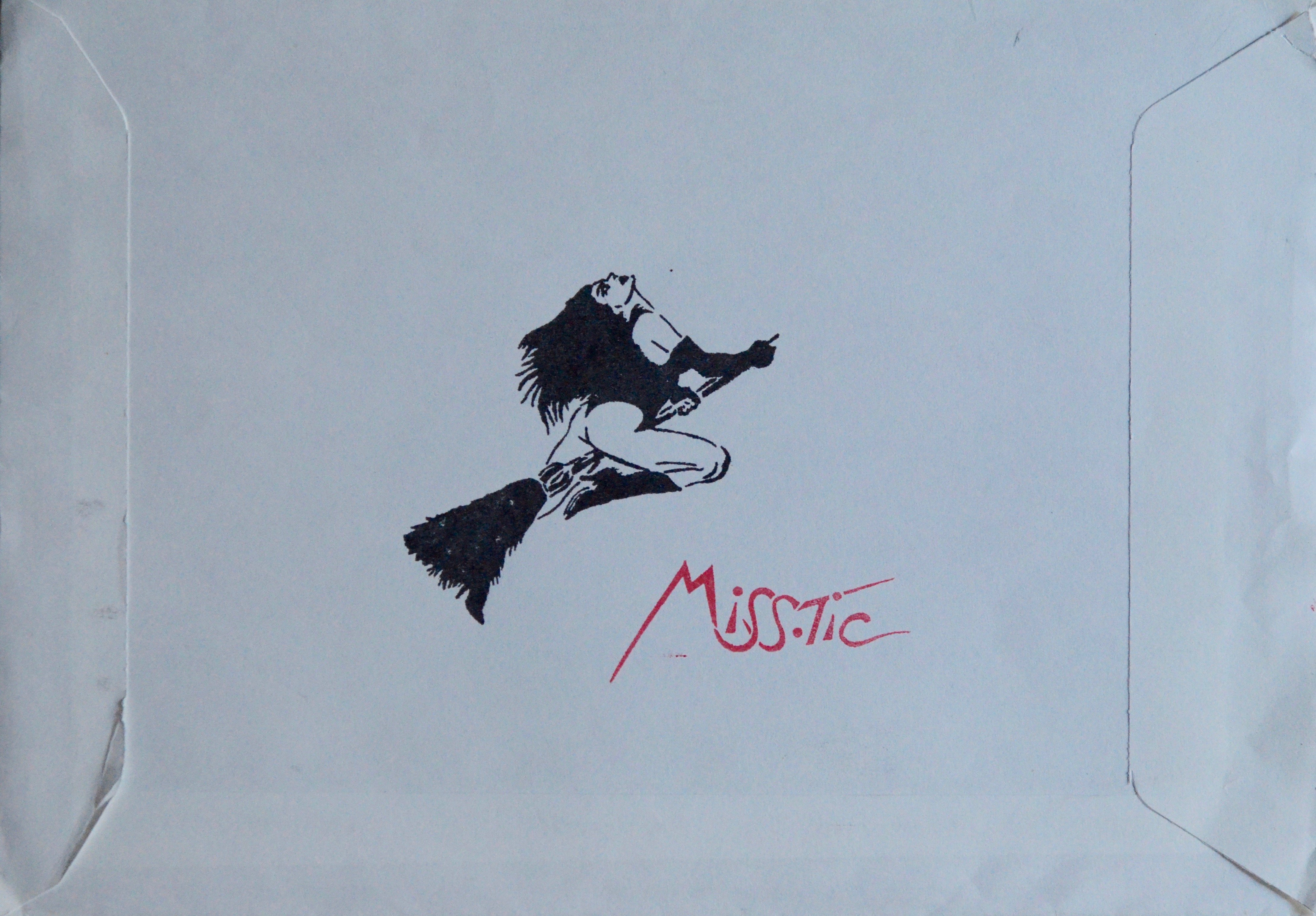 -Une enveloppe blanche avec adresse du destinataire et au verso, grand tampon noir représentant une femme sur un balais de sorcière signé Miss.Tic à l'encre rouge. Adresse au verso avec timbre et marque postale.