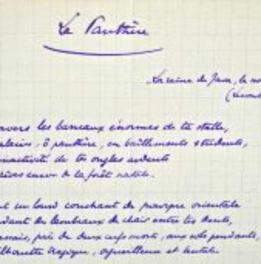 Rare sonnet autographe de Philippe Henriot, intitulé "La Panthère", composé alors qu'il n'a que 17 ans, et qui sera publié en 1946. "A travers les barreaux énormes de ta stalle, / Tu te plains, ô panthère, en bâillements stridents, / De l'inactivité de tes ongles ardents / Et tu rêves encor de la forêt natale [...]".