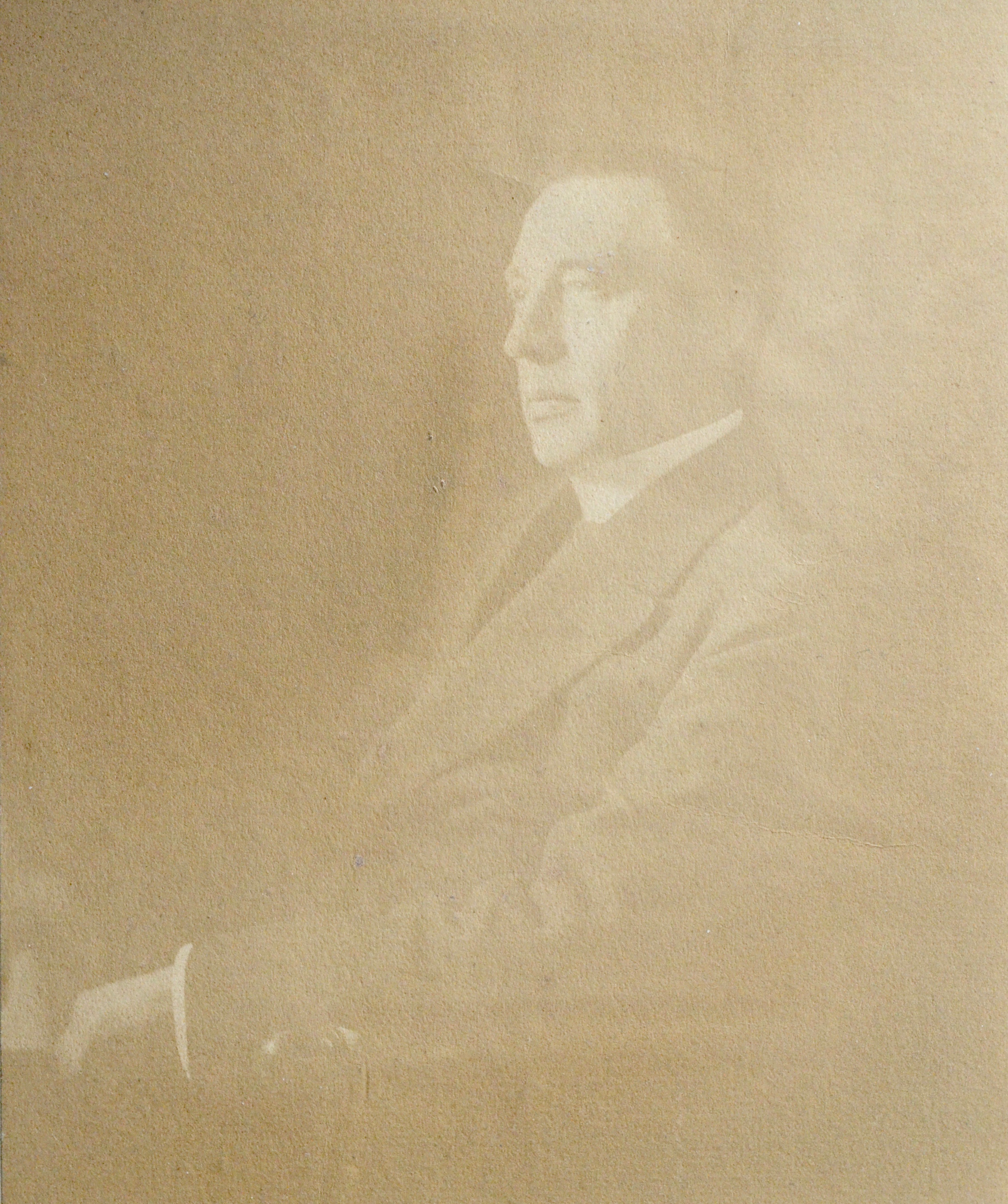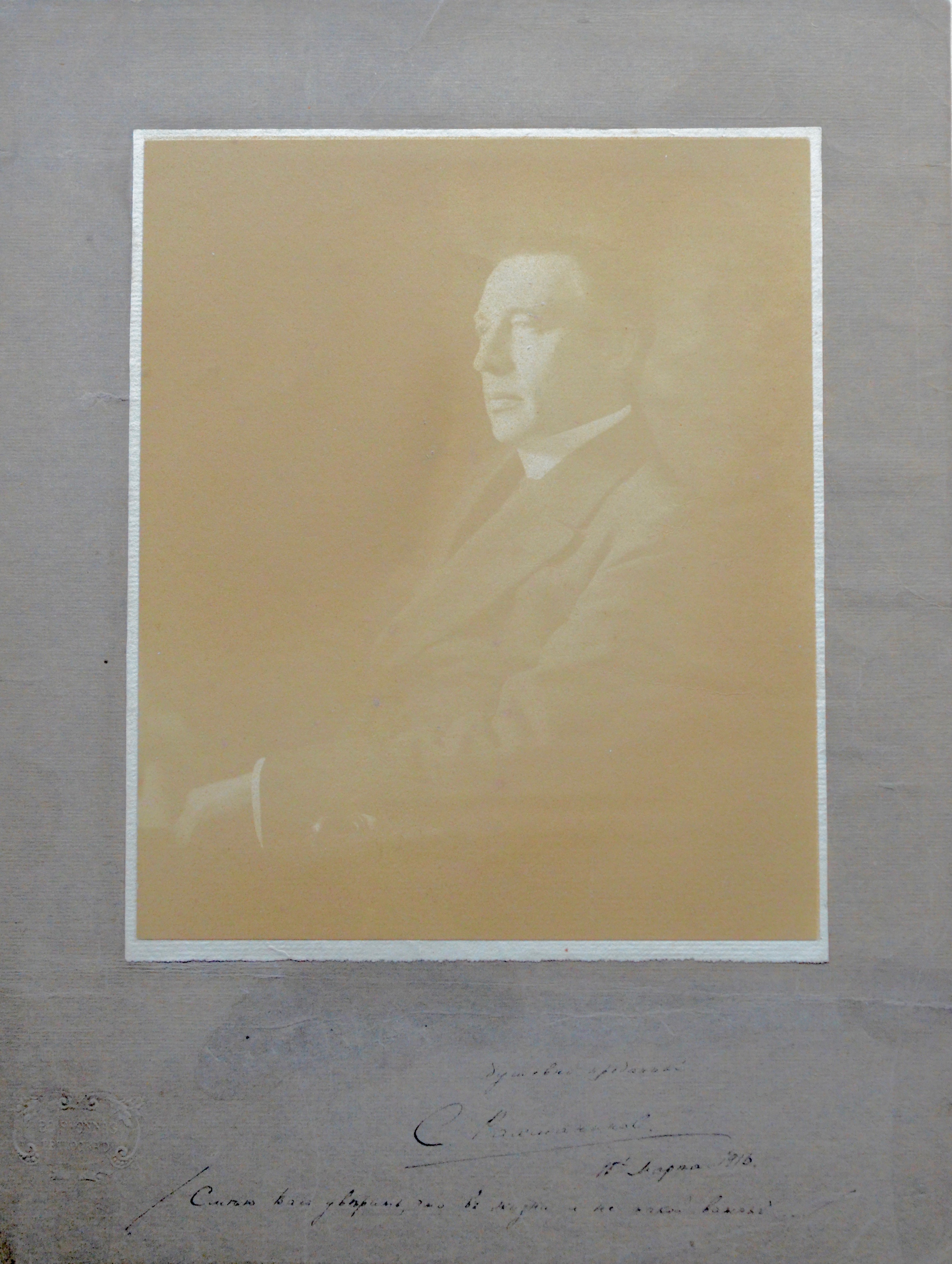 Portrait photographique de Sergueï Rachmaninov assis, en buste et de profil. Cachet sec du photographe Boissonas, à Petrograd.