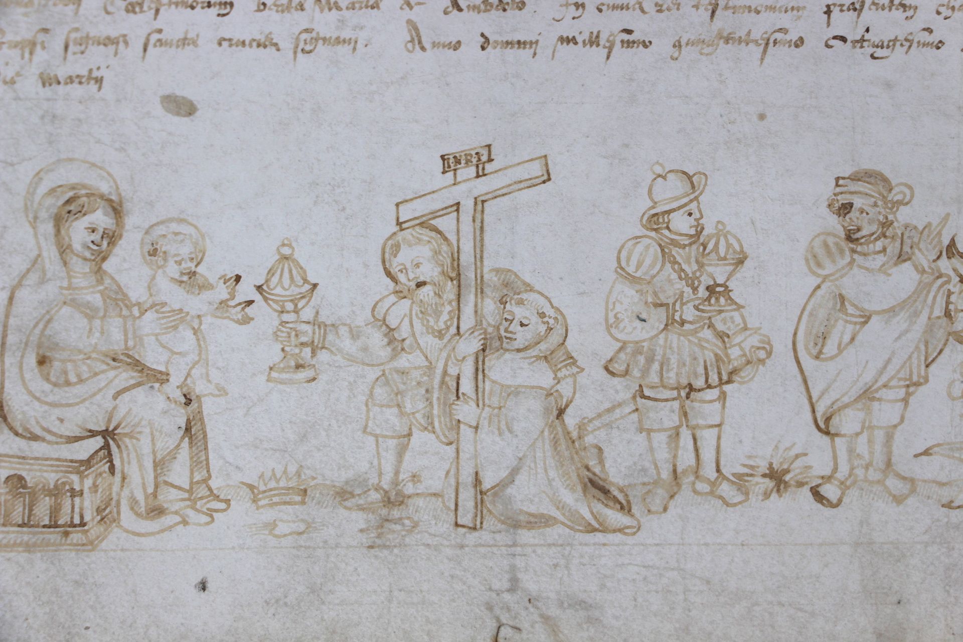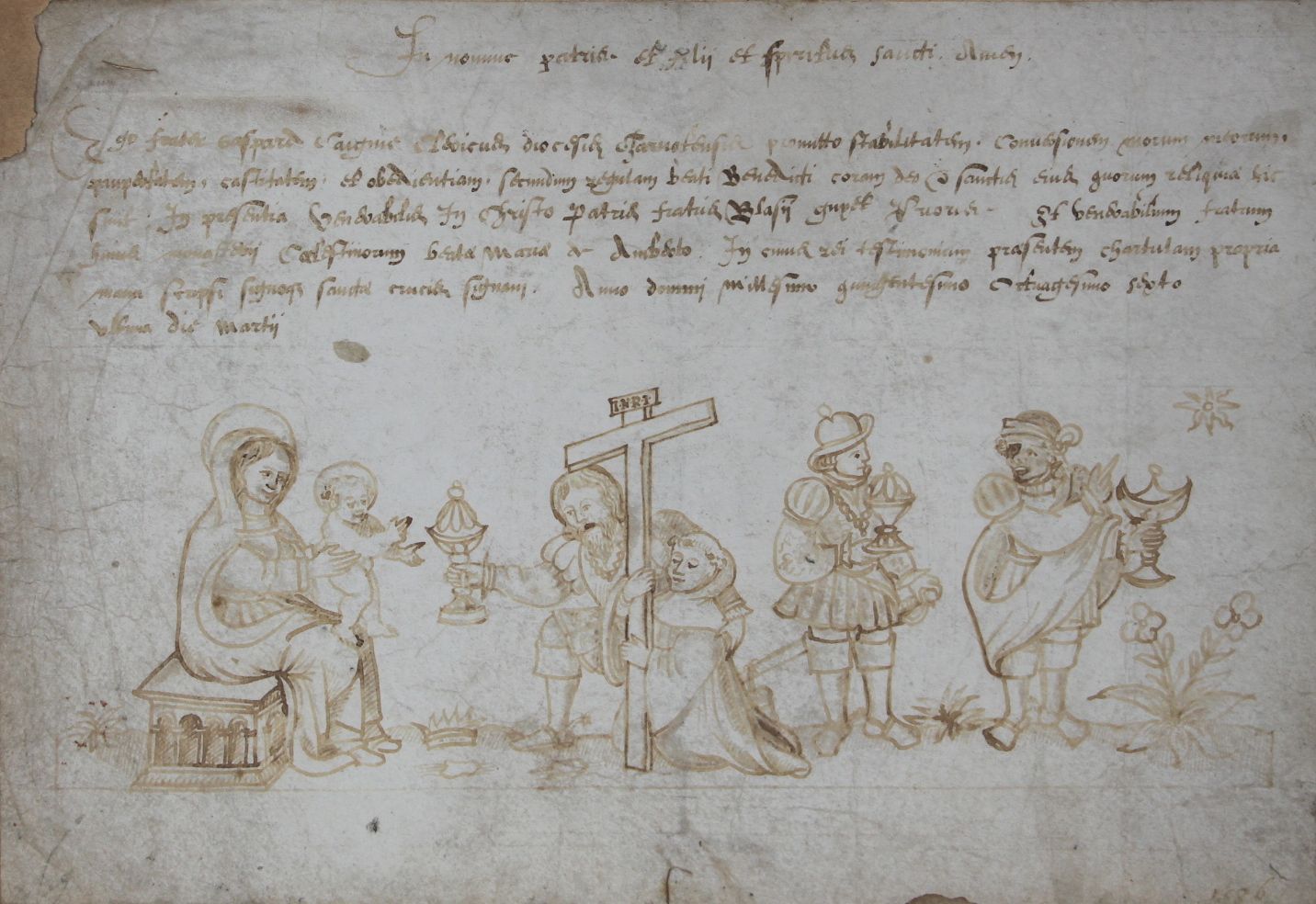 Rarissime et spectaculaire document du XVIe illustré d'un très beau dessin à la plume (scène de l'adoration des mages). Il s'agit d'une profession de voeux au monastère bénédictin d'Ambert, situé à proximité d'Orléans. Elle est illustrée d'une représentation de l'adoration des mages (mages vêtus à la mode du XVIe siècle) : Balthazar est à droite, il désigne à Melchior l'étoile qui va les guider vers l'enfant Jésus ; le frère Gaspard Saignis s'est fait représenter au pied de son saint patron, Gaspard, ce qui se faisait couramment à cette époque ; Gaspard dépose sa couronne aux pieds de la Vierge à l'enfant, et lui présente son "protégé".