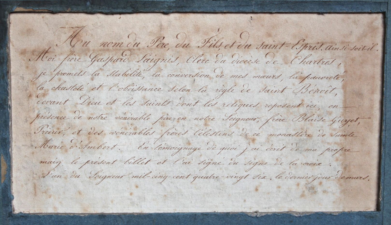Rédigé en latin, avec traduction ancienne collée au dos : "Au nom du Père, du Fils et du Saint-Esprit, ainsi soit-il. Moi frère Gaspard Saignis, clerc du diocèse de Chartres, je promets la stabilité, la conversion de mes moeurs, la pauvreté, la chasteté et l'obéissance selon la règle de Saint Benoit, devant Dieu et les saints dont les reliques reposent ici, en présence de notre vénérable père en notre Seigneur, frère Blaise Guyet, prieur, et des vénérables frères Célestins de ce monastère de Sainte-Marie d'Ambert. En témoignage de quoi j'ai écrit de ma propre main le présent billet et l'ai signé du signe de la croix [...]".