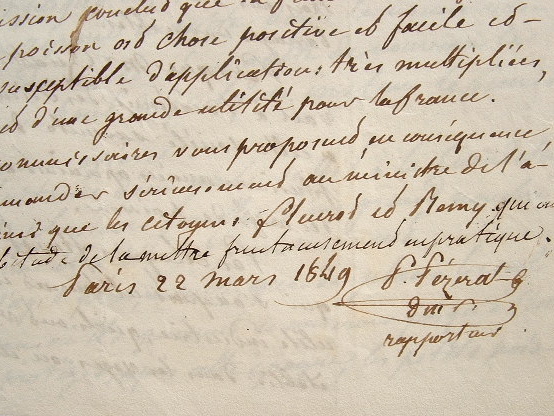Rapport fait par le comité d'agriculture de l'Assemblée Nationale par Loiset, Talon et Pézerat (rapporteur, qui l'a rédigé), sur la fécondation artificielle des oeufs de Poisson, intitulé : "Rapport sur la communication faite au comité par le citoyen Turck, représentant du peuple, au nom des citoyens Fleurot et Rémy, pêcheurs à Bielle (Vosges), sur la fécondation artificielle des oeufs de poissons". Il s'appuie sur les travaux de Quatrefages de Bréaux présentés à l'Académie des sciences et de ceux de Fleurot et Rémy qui, les premiers, ont mis au point la reproduction artificielle des truites. Le comité expose les avantages que présenterait l'application de la fécondation artificielle des poissons pour le peuplement des rivières et des océans, et explique la technique mise au point : «On prend les oeufs au moment où ils sont assez murs pour pouvoir être facilement expulsés de l'anus de la femelle par une pression modérée, exercée de haut en bas sur son abdomen. On les place dans un vase contenant assez d'eau pour qu'ils puissent y surnager et on les y agite avec ménagement, jusqu'à ce qu'on les ait séparé les uns des autres. On répand ensuite dans le même vase la lactance du mâle et on agite de nouveau le mélange. Au bout de quelques instants, la fécondation se trouve opérée. La lactance d'un mâle suffit à la fécondation de plusieurs femelles, d'un grand nombre même [...]. Pour les poissons d'eau douce, on peut se borner pour atteindre ce double but de déposer les oeufs fécondés dans une eau tranquille, à fond d'herbes aquatiques et à les protéger par un treillis. Pour les saumons, une méthode qui a réussi, consiste à les placer dans une boîte étroite, longue de plusieurs mètres, et dans laquelle on fait passer continuellement un courant peu rapide, d'eau vive, au moyen de deux ouvertures pratiquées à ses extrêmités et munies d'un grillage très serré [...]». Il explique que les petits poissons peuvent croître quelques temps sans apport d'aliments et que les saumoneaux peuvent vivre jusqu'à l'âge de trois ans dans des eaux douces. «Les citoyens Fleurot et Rémy sont des pêcheurs qui s'occupent utilement et depuis longtemps de cette utile industrie, qu'ils ont vraisemblablement trouvée établie dans les Vosges, où elle paraîtrait avoir été importée d'Allemagne [...]. Depuis la communication dont notre collègue a saisi le comité, il a fait venir sur commission, des oeufs de truites, fécondés artificiellement dans les Vosges par les citoyens Fleurot et Rémy. Ces oeufs contenaient des embryons, les uns en naissance, les autres très rapprochés du moment de percer la coque de l'oeuf qui les tenait captifs. Dans un vase séparé faisant partie du même envoi, nageaient quelques petites truites, très vivaces et nées depuis peu de jours seulement [...]». La commission conclut à l'utilité et l'applicabilité de la méthode. "Vos commissaires vous proposent, en conséquence, de la recommander sérieusement au ministre de l'agriculture, ainsi que les citoyens Fleurot et Rémy qui ont acquis l'habitude de la mettre fructueusement en pratique". [Il s'agit là de l'un des tout premiers rapports sur la question, la pisciculture ne s'étant développée qu'à partir de la fin du XIXe siècle].