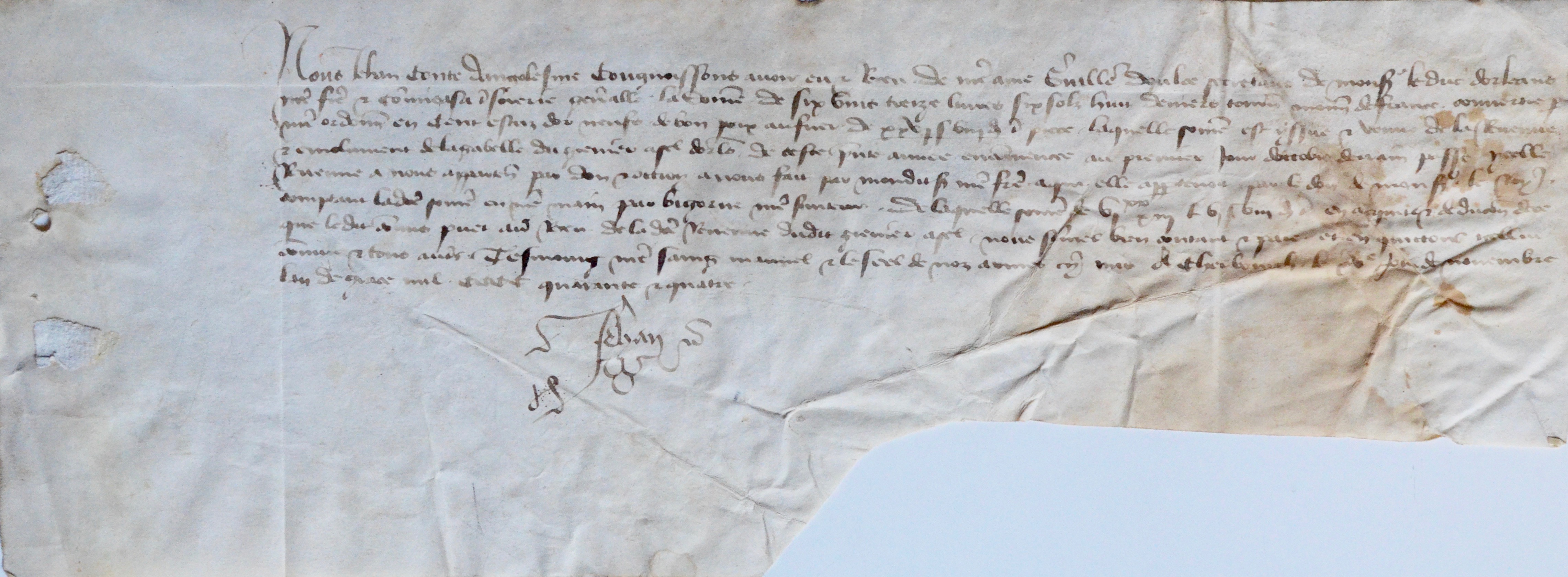"Nous Jehan conte d'angoulesme congnoissons avoir eu et recu de nostre aime Guillaume Doulce secrétaire de Mons le duc dorleans nostre frère [...] la somme de six ving treize livres six sols huit deniers tournois monnoie de France [...] laquelle somme est yssue et venue de la revenue et emolument de la gabelle du grenier a sel dorleans de ceste présente année [...]".