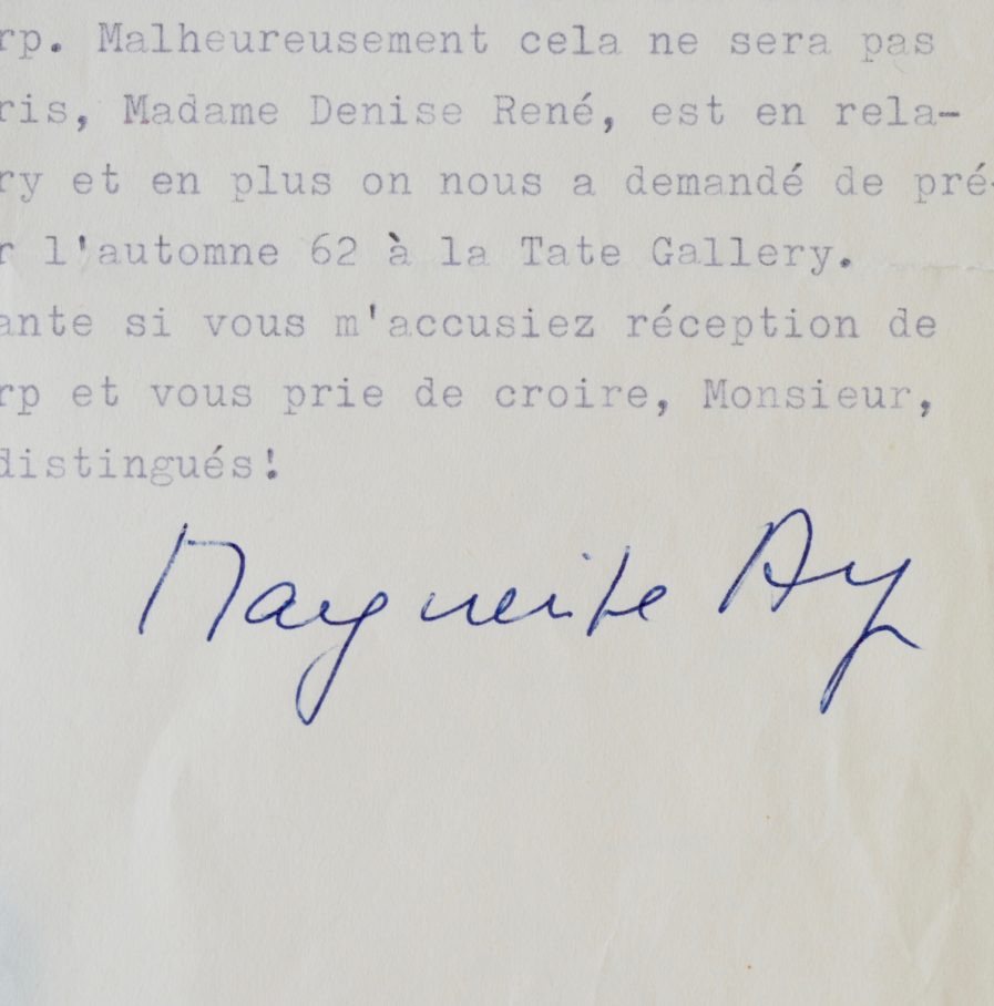 "[...] Je suis heureuse de pouvoir vous envoyer aujourd'hui un petit hommage à Magritte que mon mari sur votre demande du 31 mai a écrit pour vous. Il serait peut être utile que vous nous envoyiez une épreuve avant l'impression définitive, car la moindre petite faute d'impression dans ce texte surréaliste le rendrait inintelligible. Monsieur Hugnet nous a parlé de votre désir de faire une fois une exposition d'oeuvres de Jean Arp. Malheureusement cela ne sera pas possible, car notre marchand de Paris, Madame Denise René, est en relation étroite avec la Hanovre Gallery et en plus on nous a demandé de préparer une grande rétrospective pour l'automne 62 à la Tate Gallery [...]." (Meudon, 7/6/61).