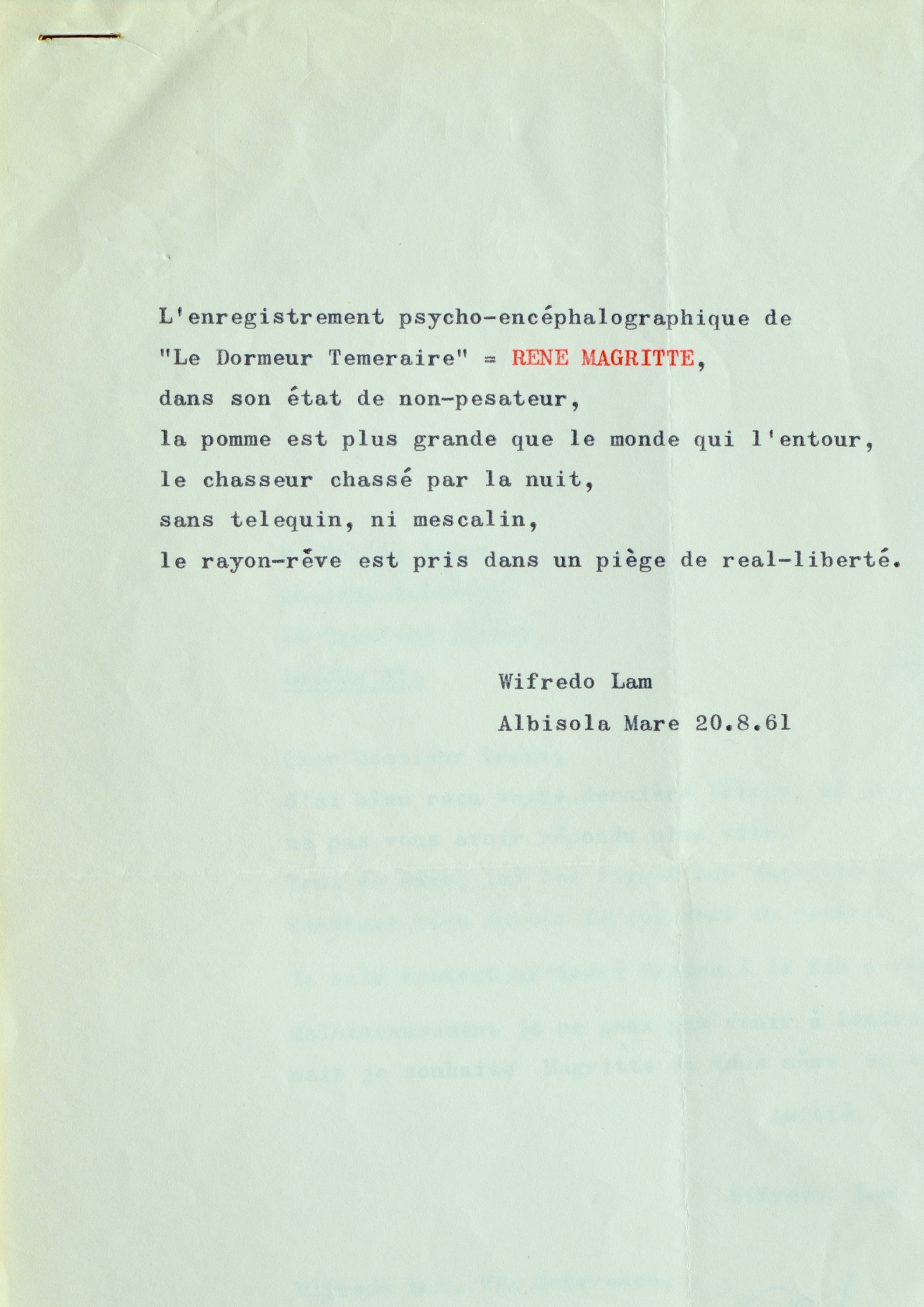 "L'enregistrement psycho-encéphalographique de "Le Dormeur Téméraire" = RENE MAGRITTE [à l'encre rouge], dans son état de non-pesa[n]teur, la pomme est plus grande que le monde qui l'entour, le chasseur chassé par la nuit, sans telequin, ni mescalin, le rayon-rêve est pris dans un piège de real-liberté. [...]"