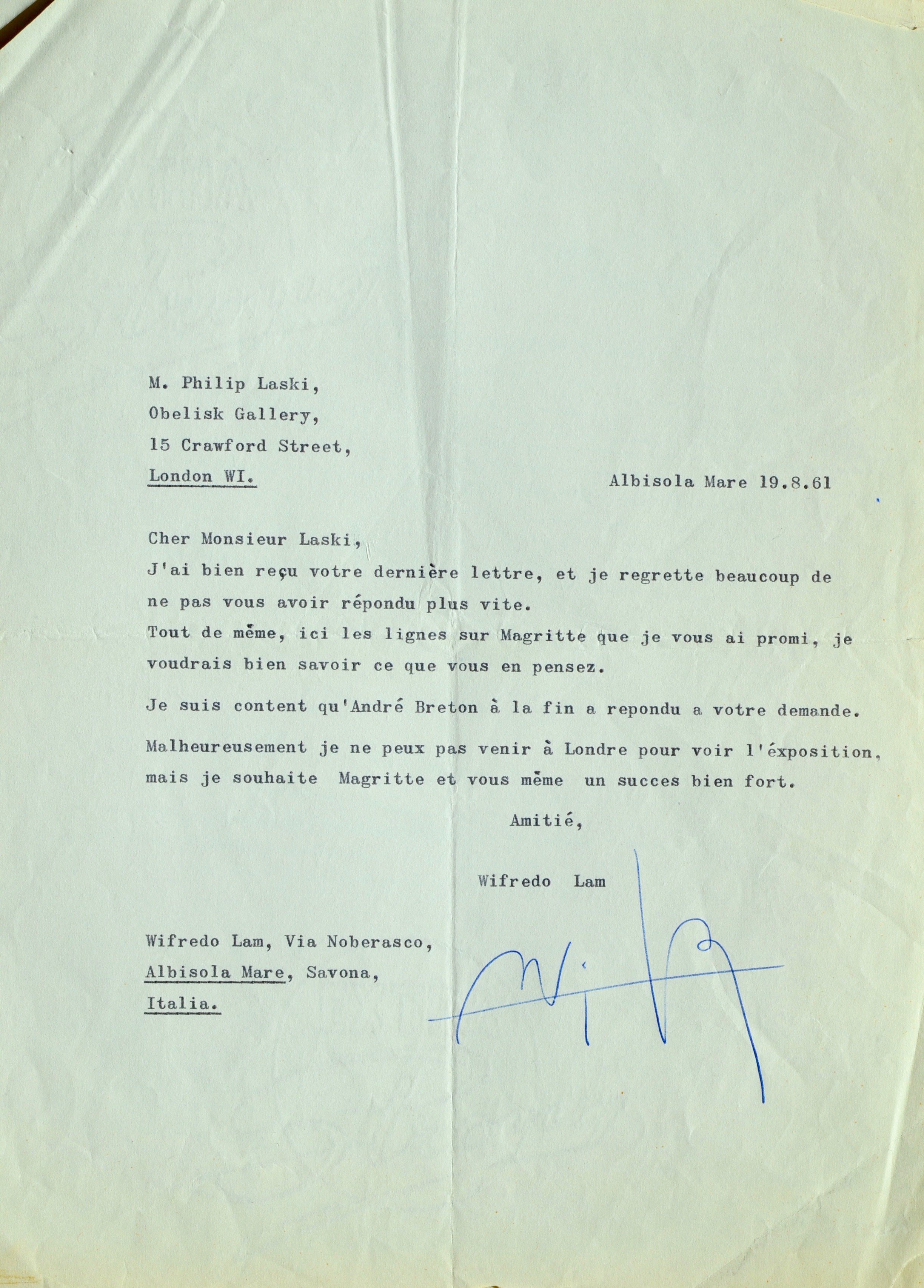 Wifredo Lam (Sagua la Grande, 1902/1982)Lettre dactylographiée avec signature autographe de Wifredo Lam, adressée au galeriste anglais Philip Laski à l'occasion de l'exposition organisée par ce dernier, en 1961, consacrée à son ami René Magritte. Il y évoque également un autre ami, André Breton :